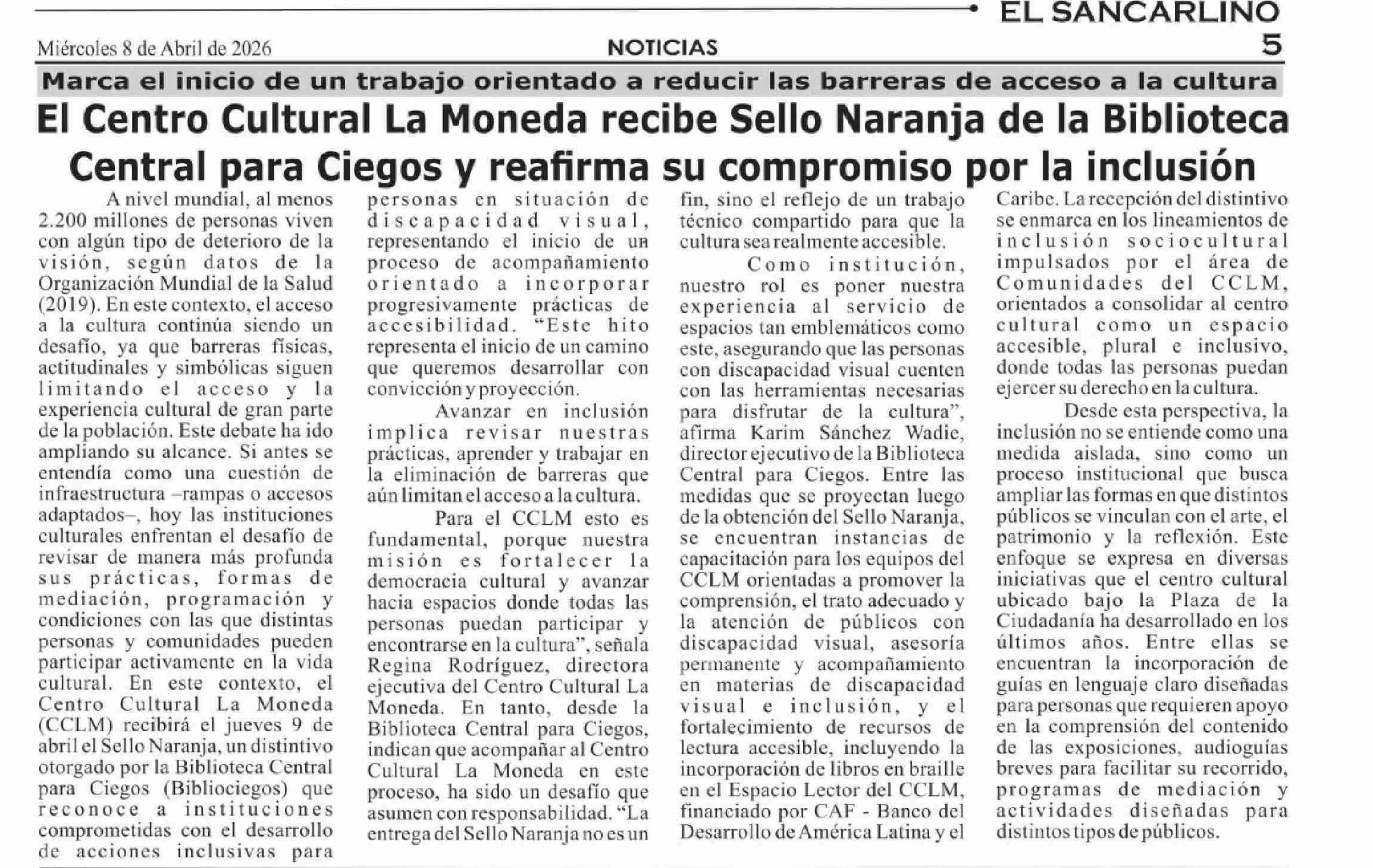 El Centro Cultural La Moneda recibe Sello Naranja de la Biblioteca Central para Ciegos y reafirma su compromiso con la inclusión
