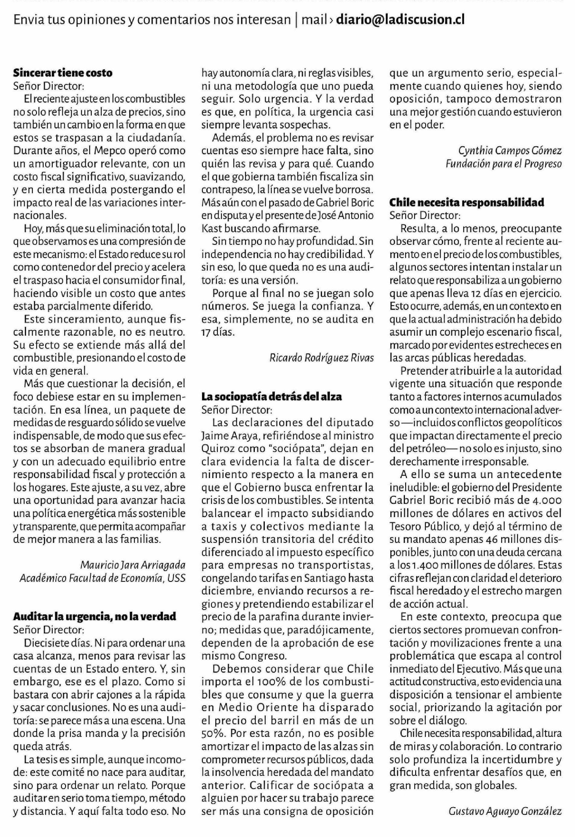 | Título: | Cartas: Sincerar tiene costo Señor Director: El reciente ajuste en los combustibles no solo refleja un alza de precios, sino también un cambio en la forma en que estos se traspasan a la ciudadanía. Durante años, el Mepco operó como un amortiguador relevante, con un costo fiscal significativo, suaviz |