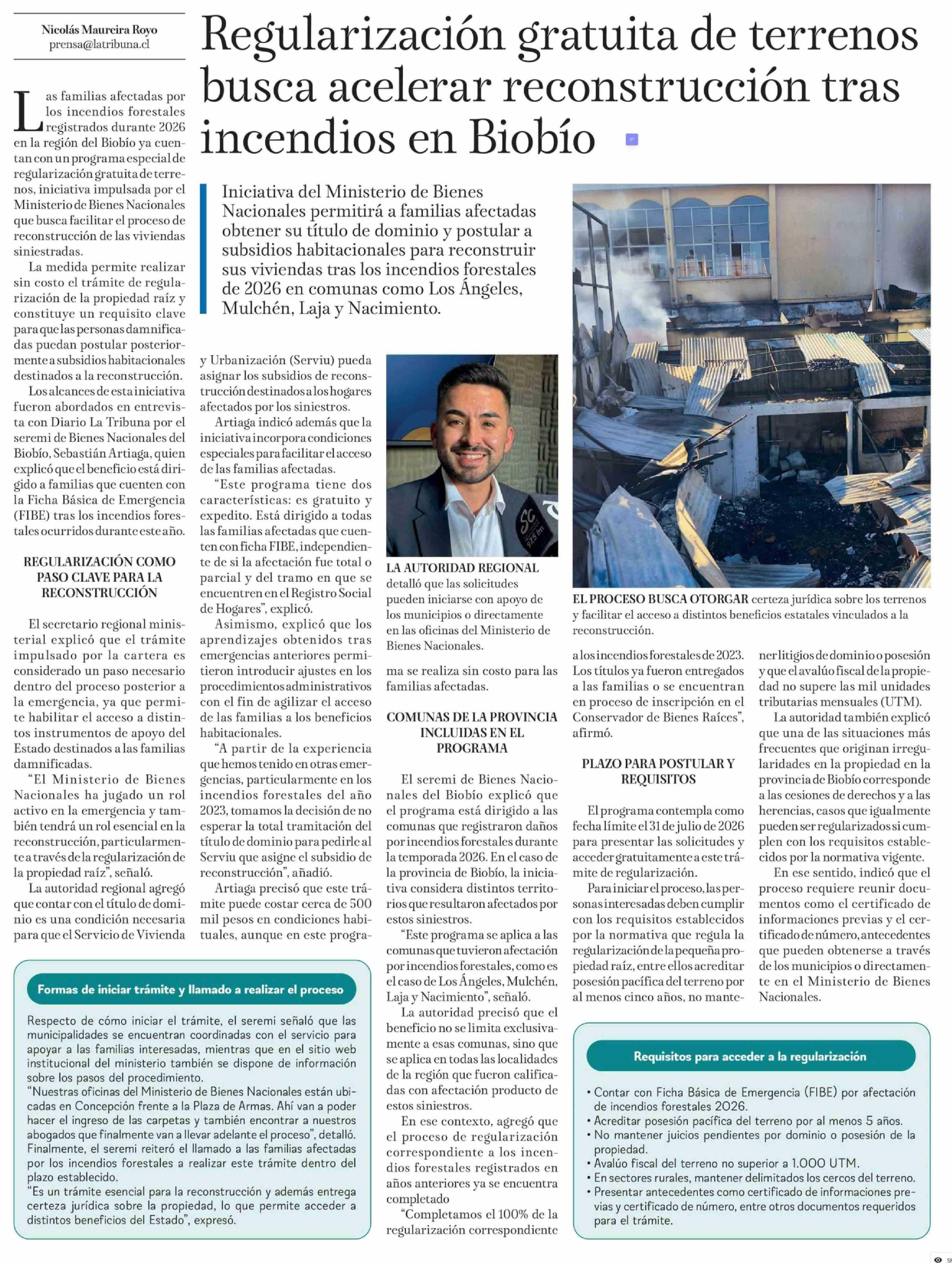 Regularización gratuita de terrenos busca acelerar reconstrucción tras incendios en Biobío