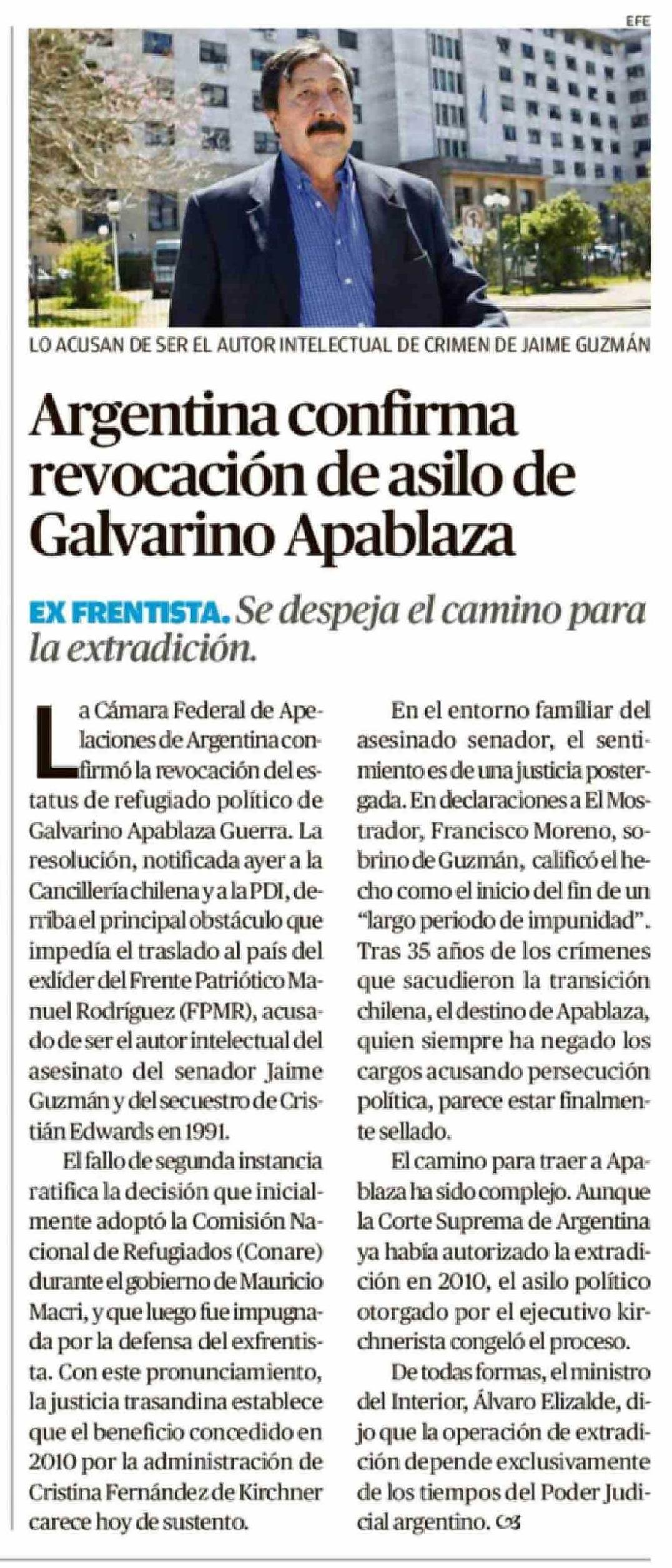 Argentina confirma revocación de asilo de Galvarino Apablaza