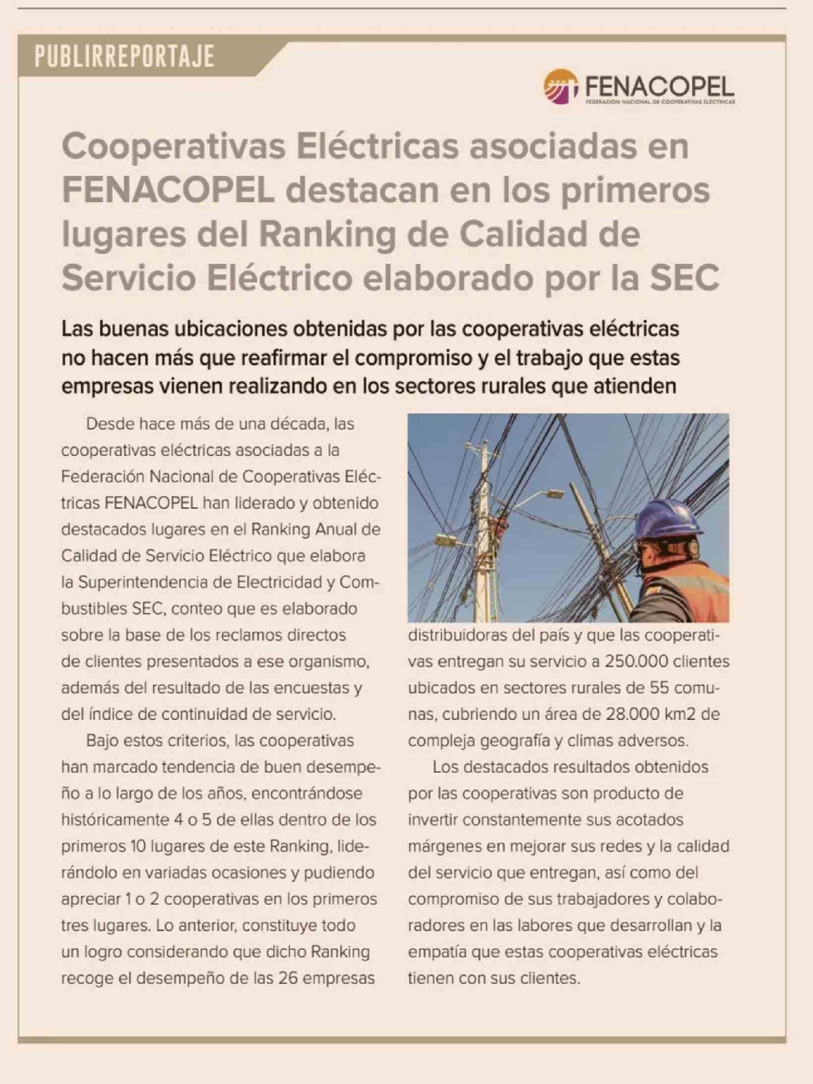 | Título: | Cooperativas Eléctricas asociadas en FENACOPEL destacan en los primeros lugares del Ranking de Calidad de Servicio Eléctrico elaborado por la SEC |