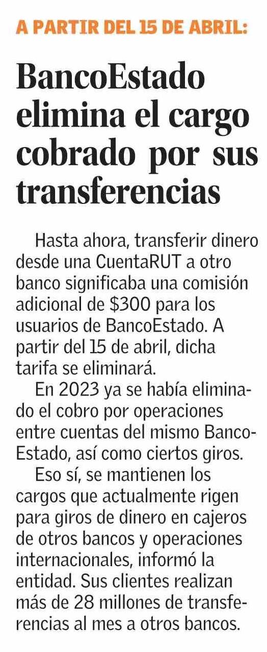BancoEstado elimina el cargo cobrado por sus transferencias