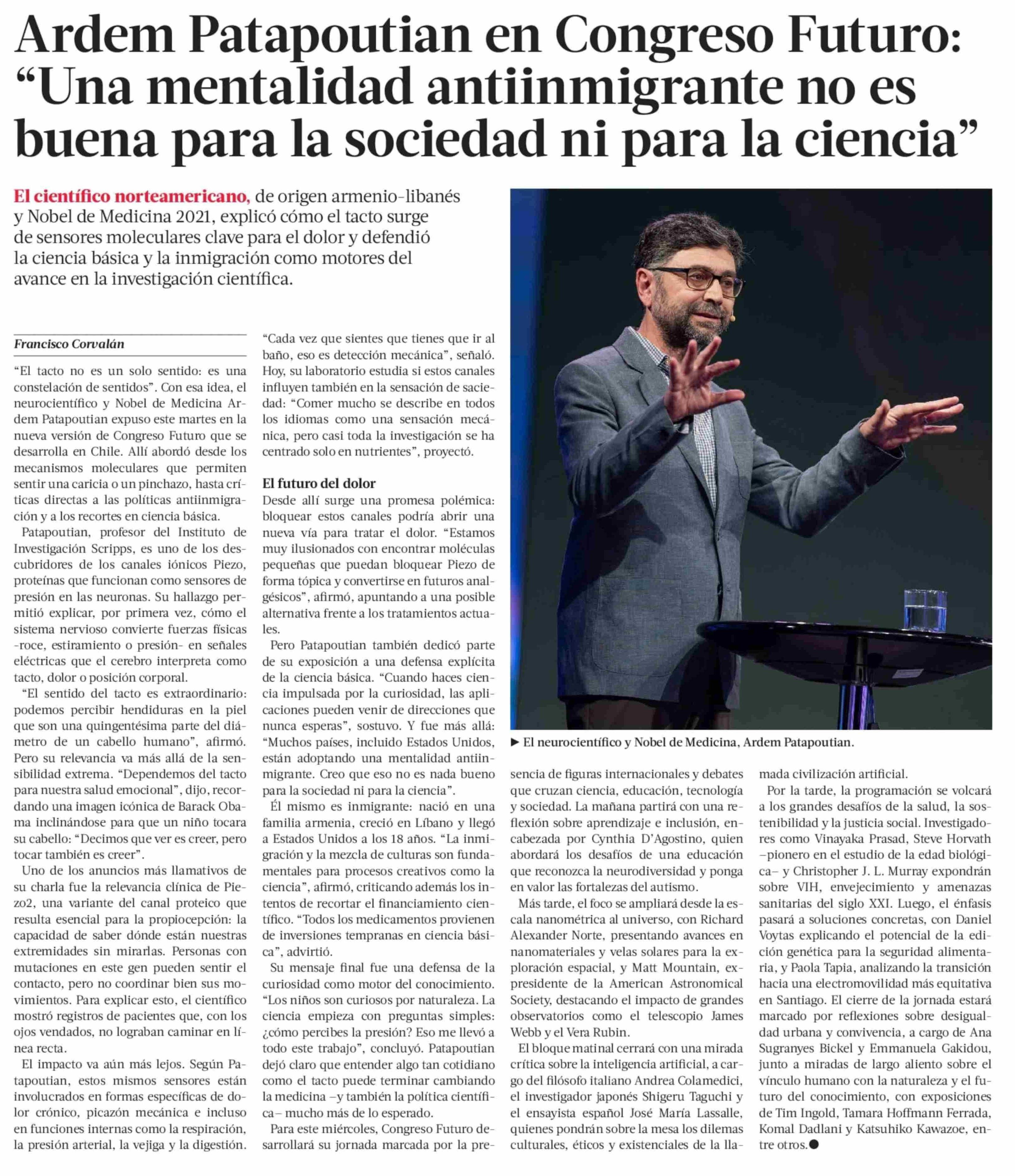 Ardem Patapoutian en Congreso Futuro: "Una mentalidad antiinmigrante no es buena para la sociedad ni para la ciencia"