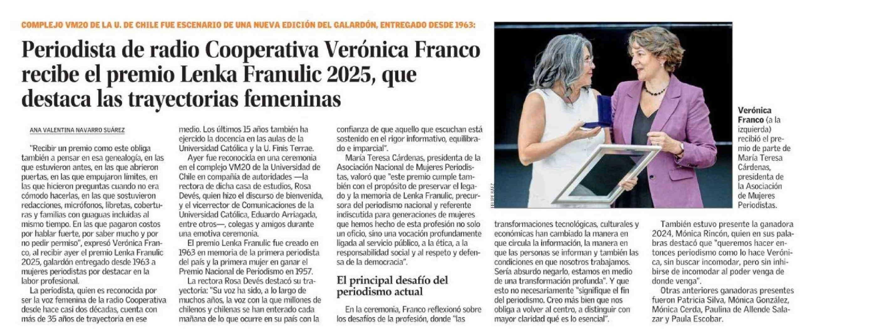 | Título: | Periodista de radio Cooperativa Verónica Franco recibe el premio Lenka Franulic 2025, que destaca las trayectorias femeninas |