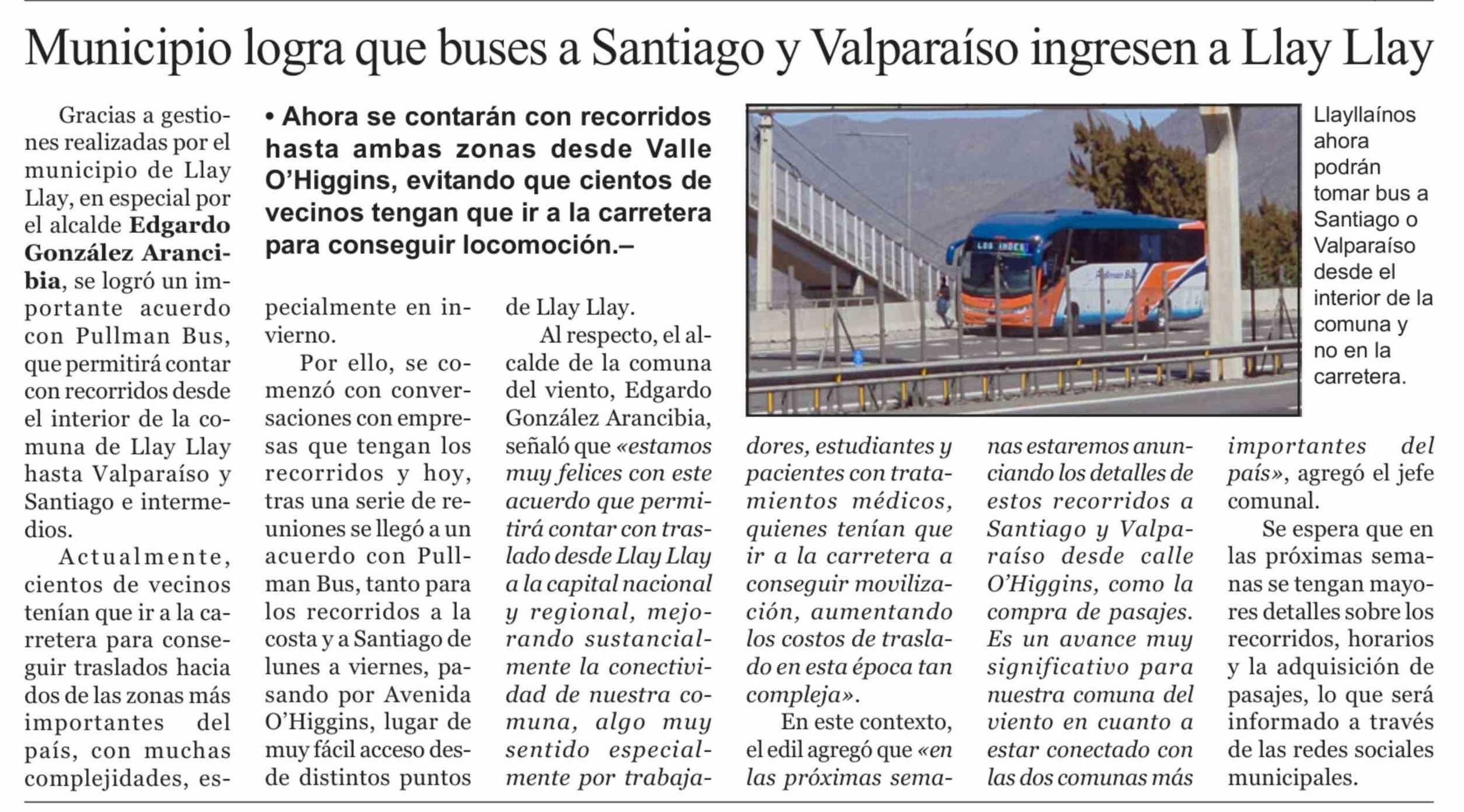 Municipio logra que buses a Santiago y Valparaíso ingresen a Llay Llay