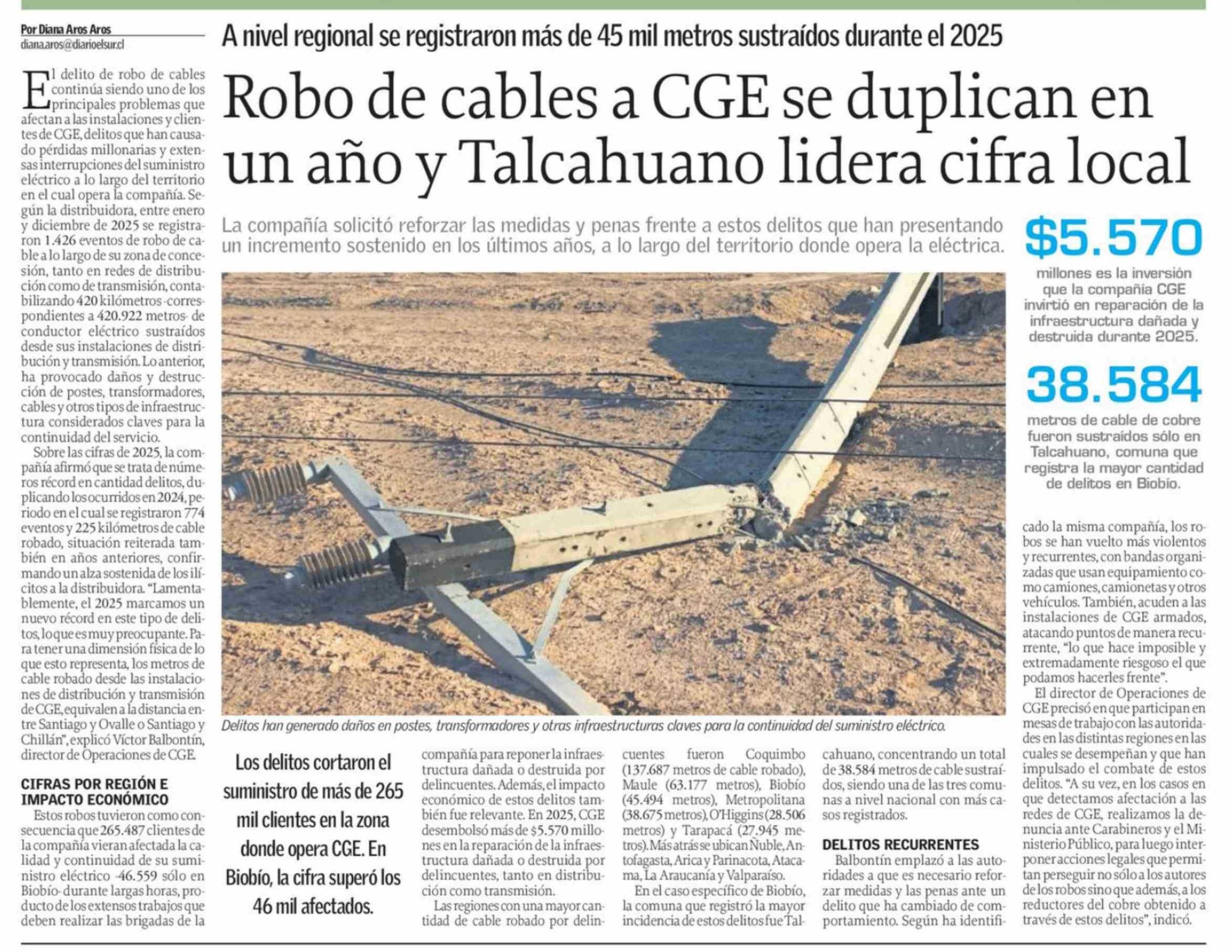 Robo de cables a CGE se duplican en un año y Talcahuano lidera cifra local