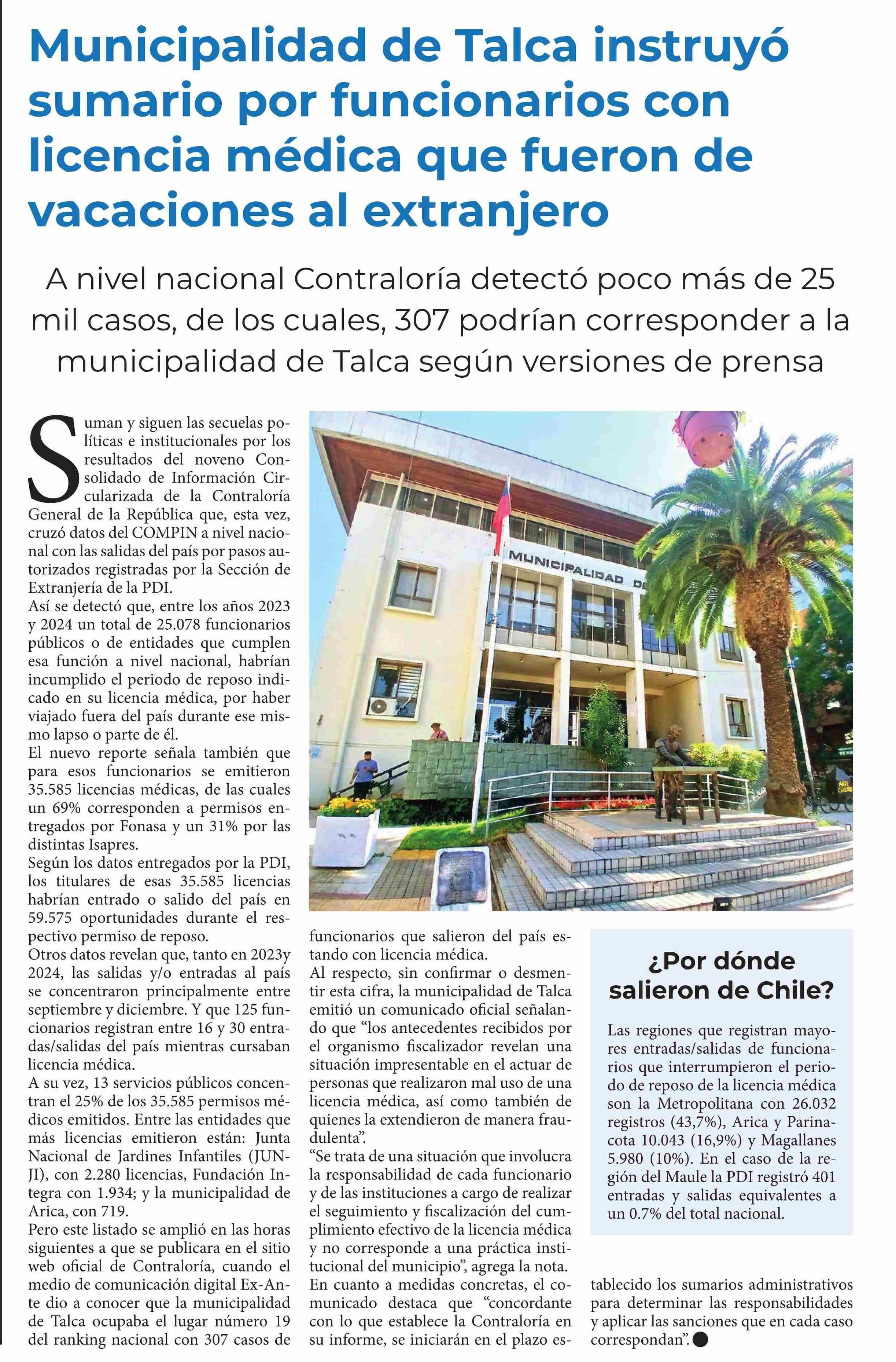 Municipalidad de Talca instruyó sumario por funcionarios con licencia médica que fueron de vacaciones al extranjero
