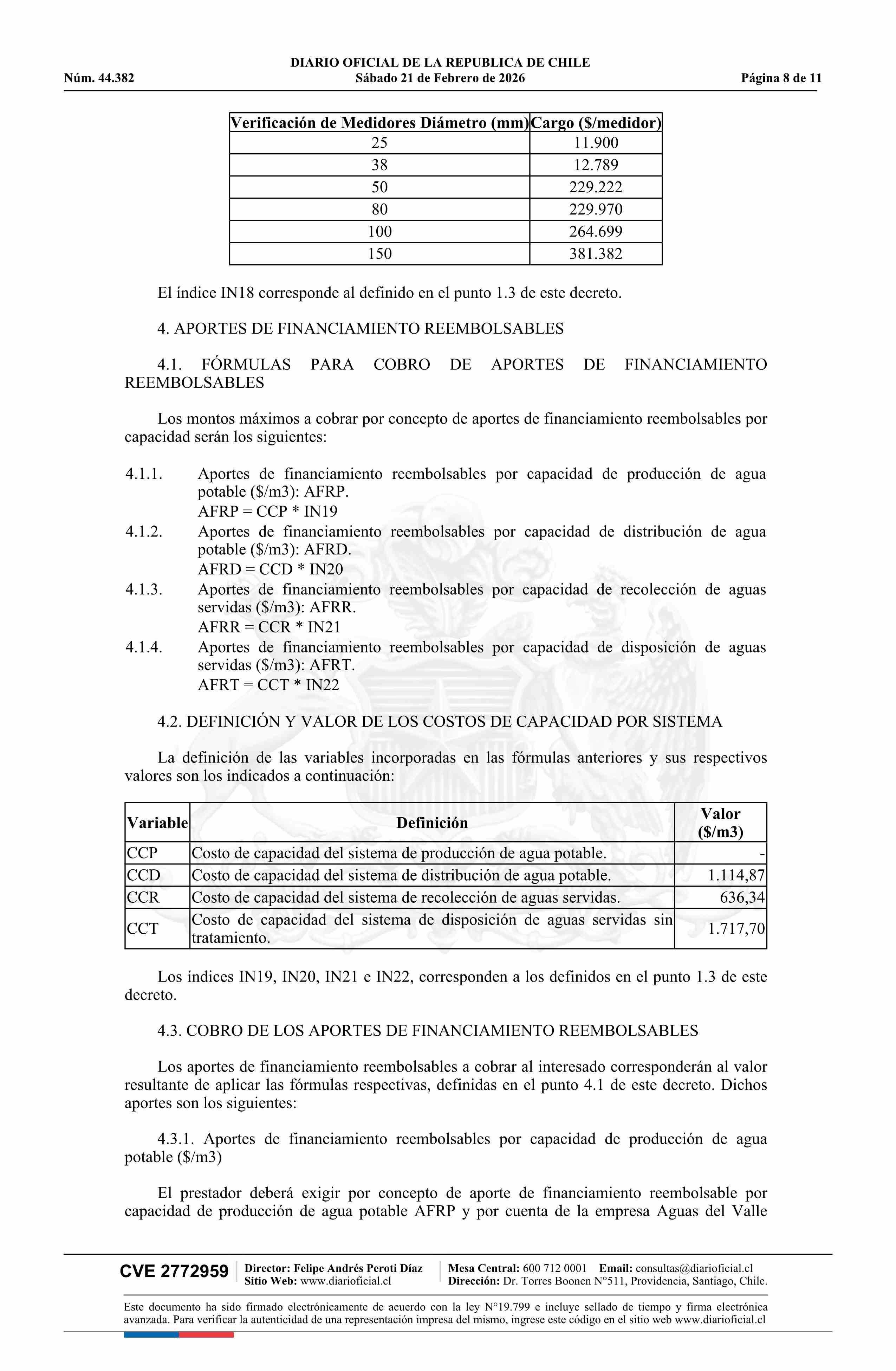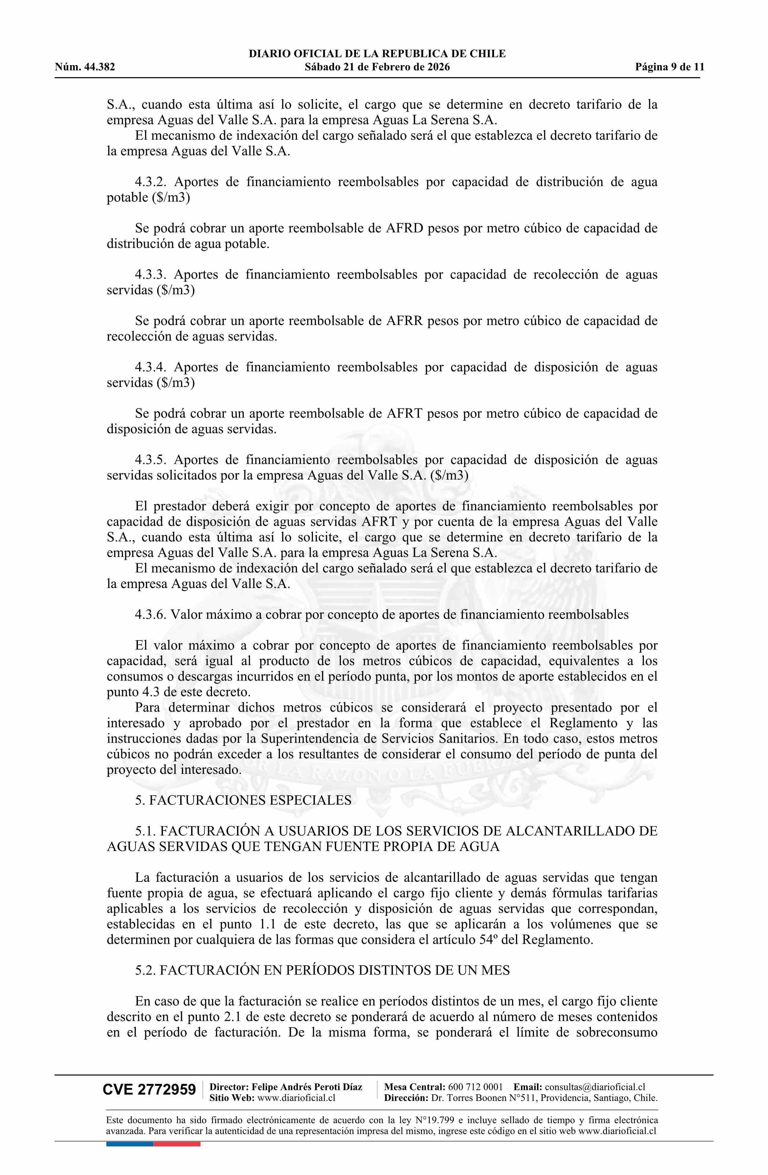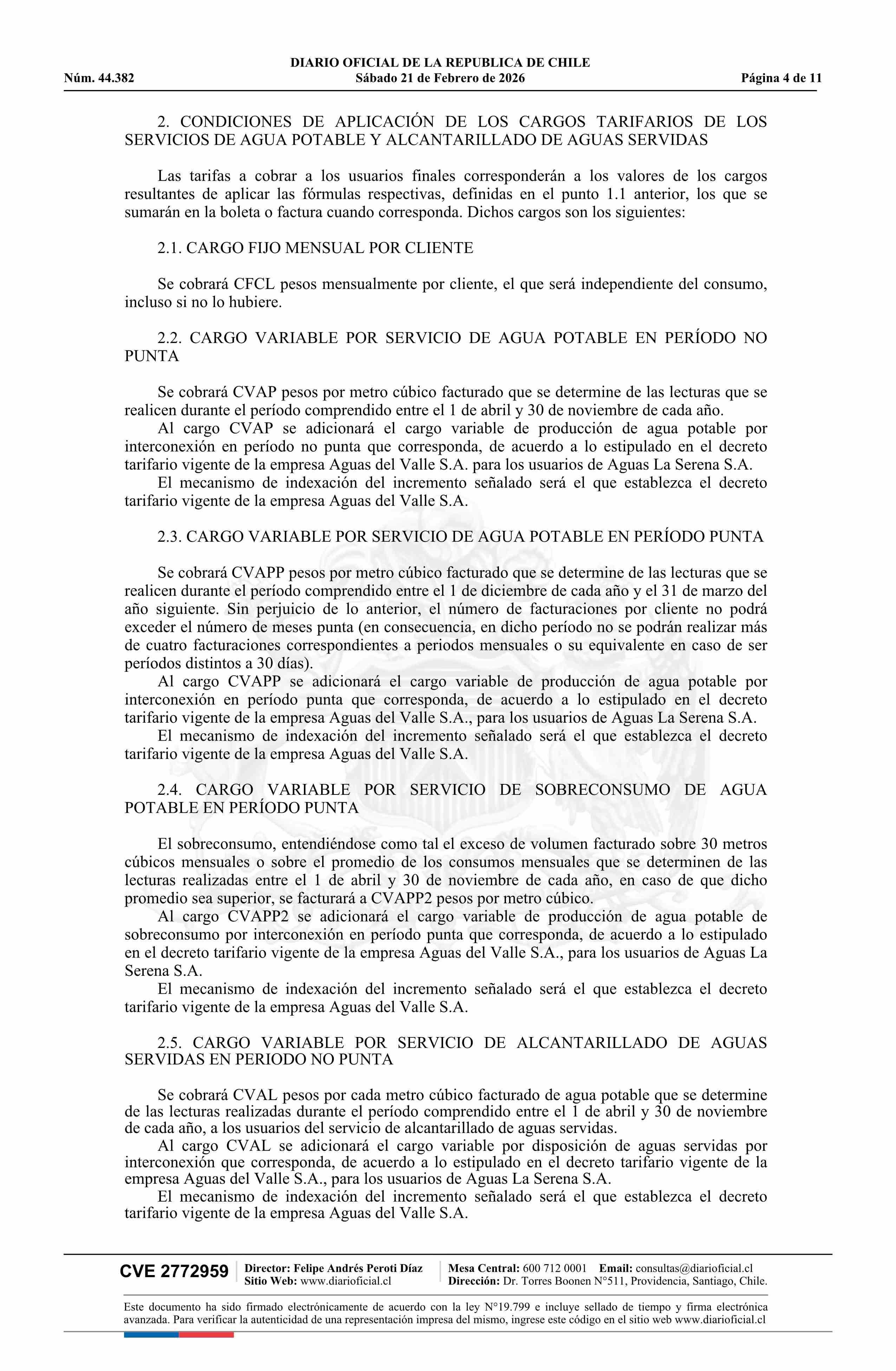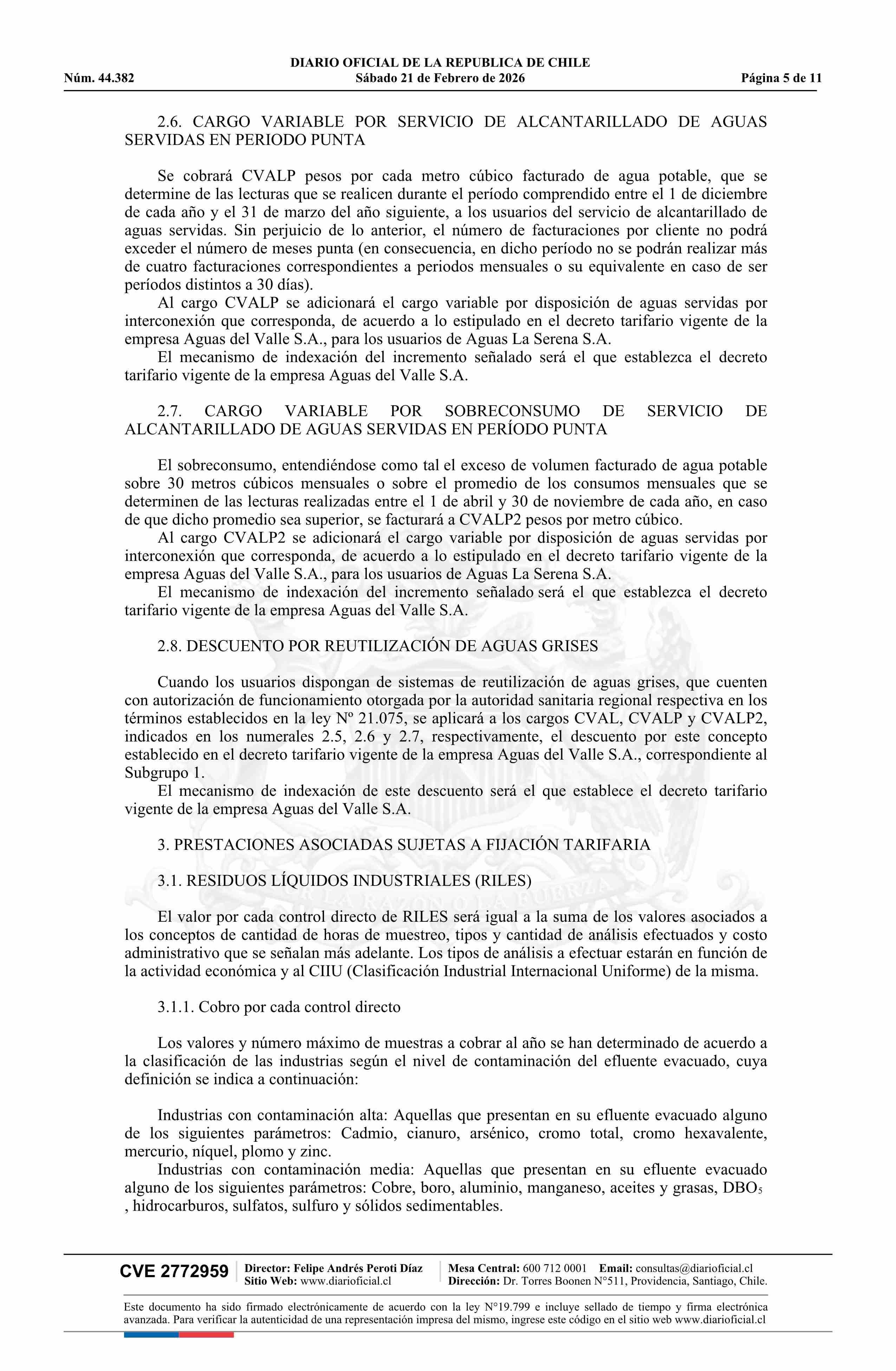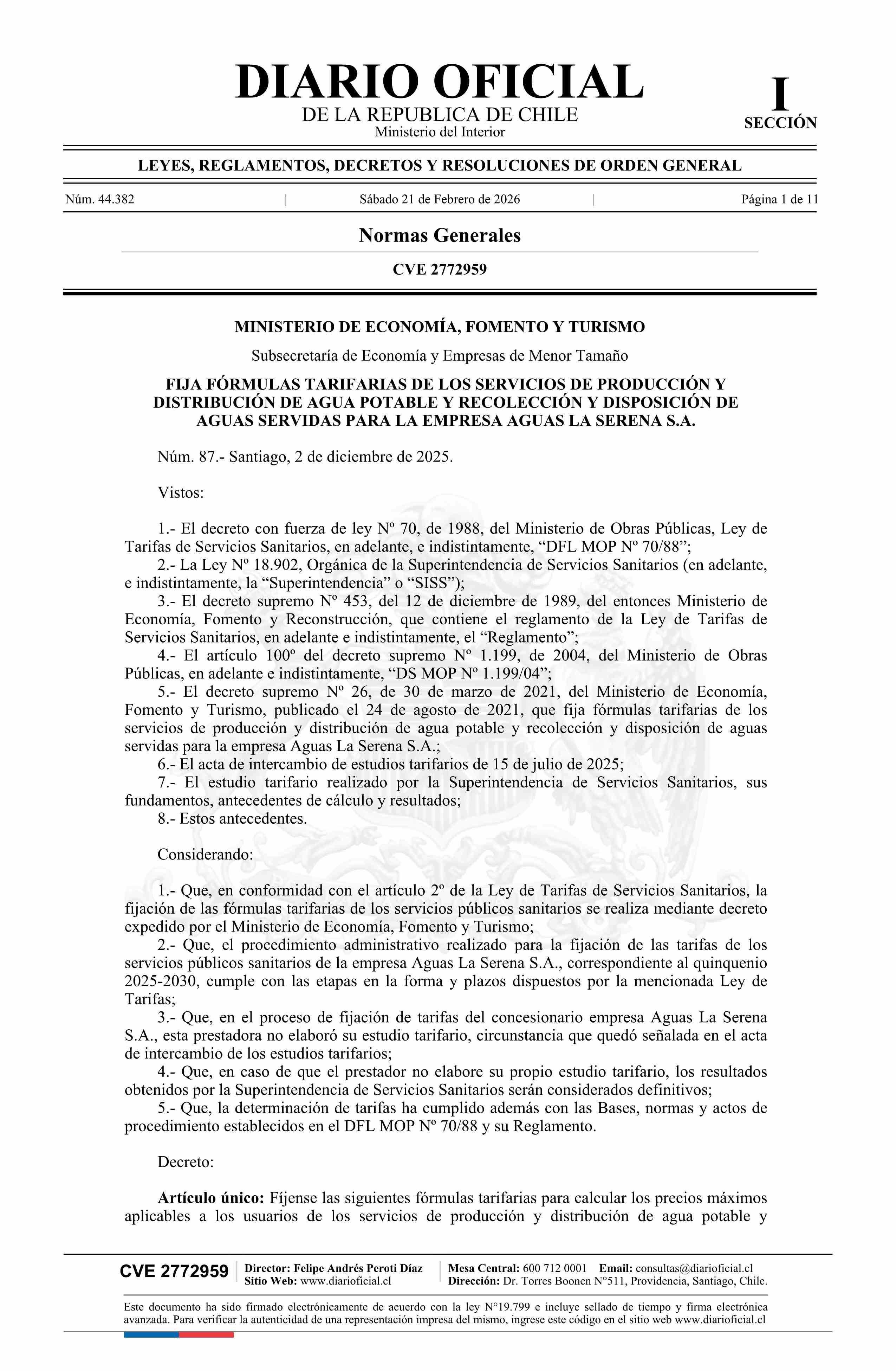 | Título: | Decreto número 87, de 2025.- Fija fórmulas tarifarias de los servicios de producción y distribución de agua potable y recolección y disposición de aguas servidas para la empresa Aguas La Serena S.A. |