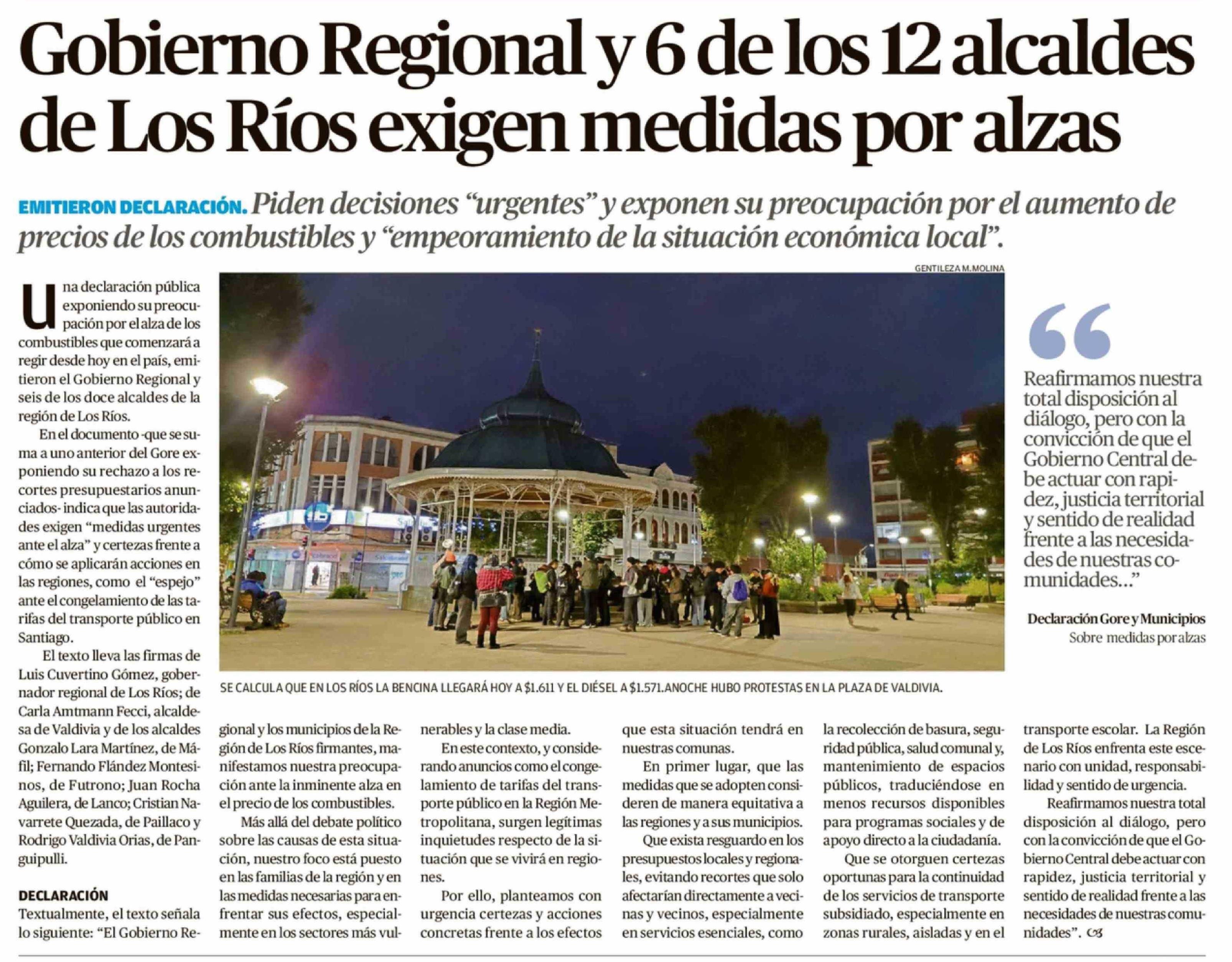 Gobierno Regional y 6 de los 12 alcaldes de Los Ríos exigen medidas por alzas