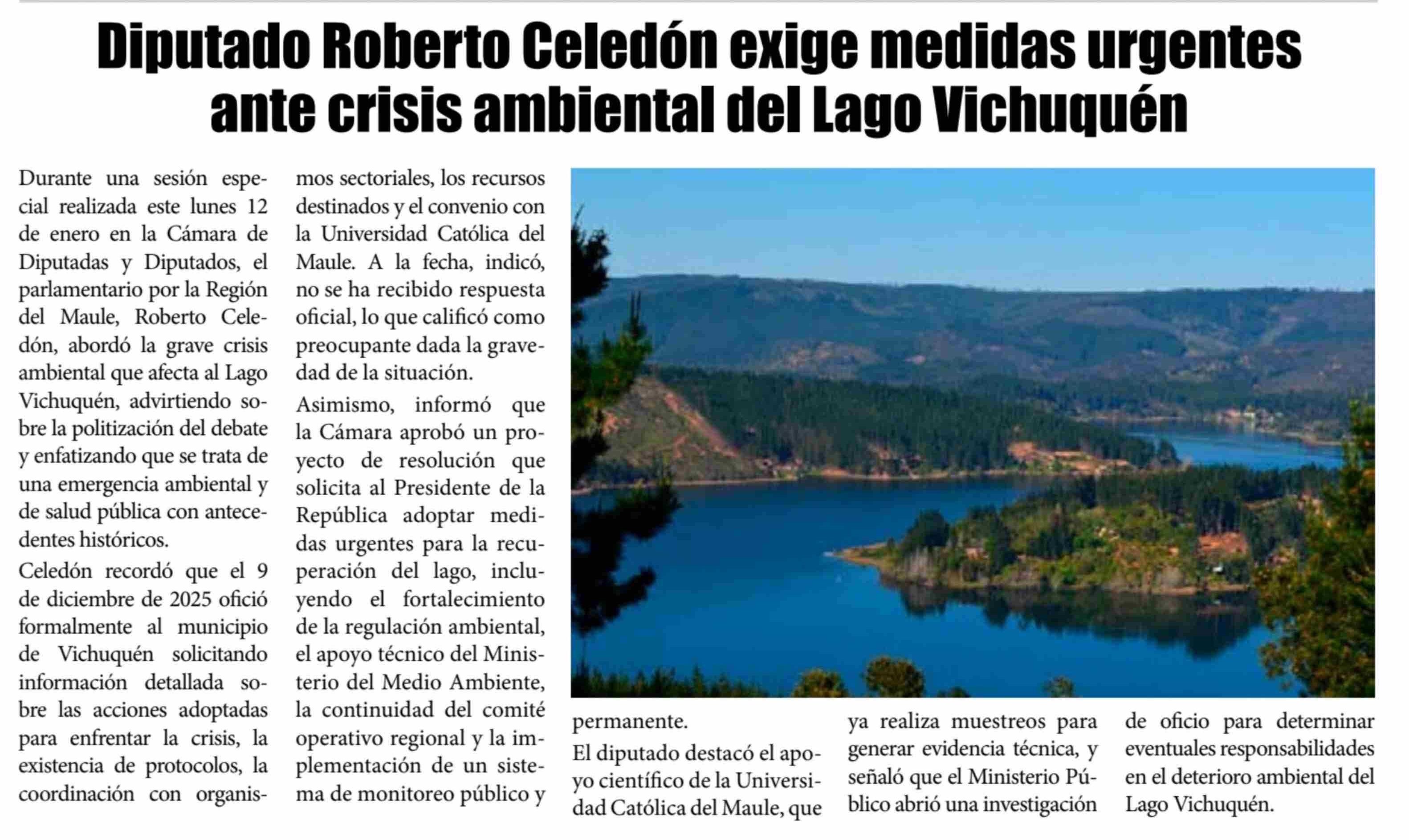 Diputado Roberto Celedón exige medidas urgentes ante crisis ambiental del Lago Vichuquen
