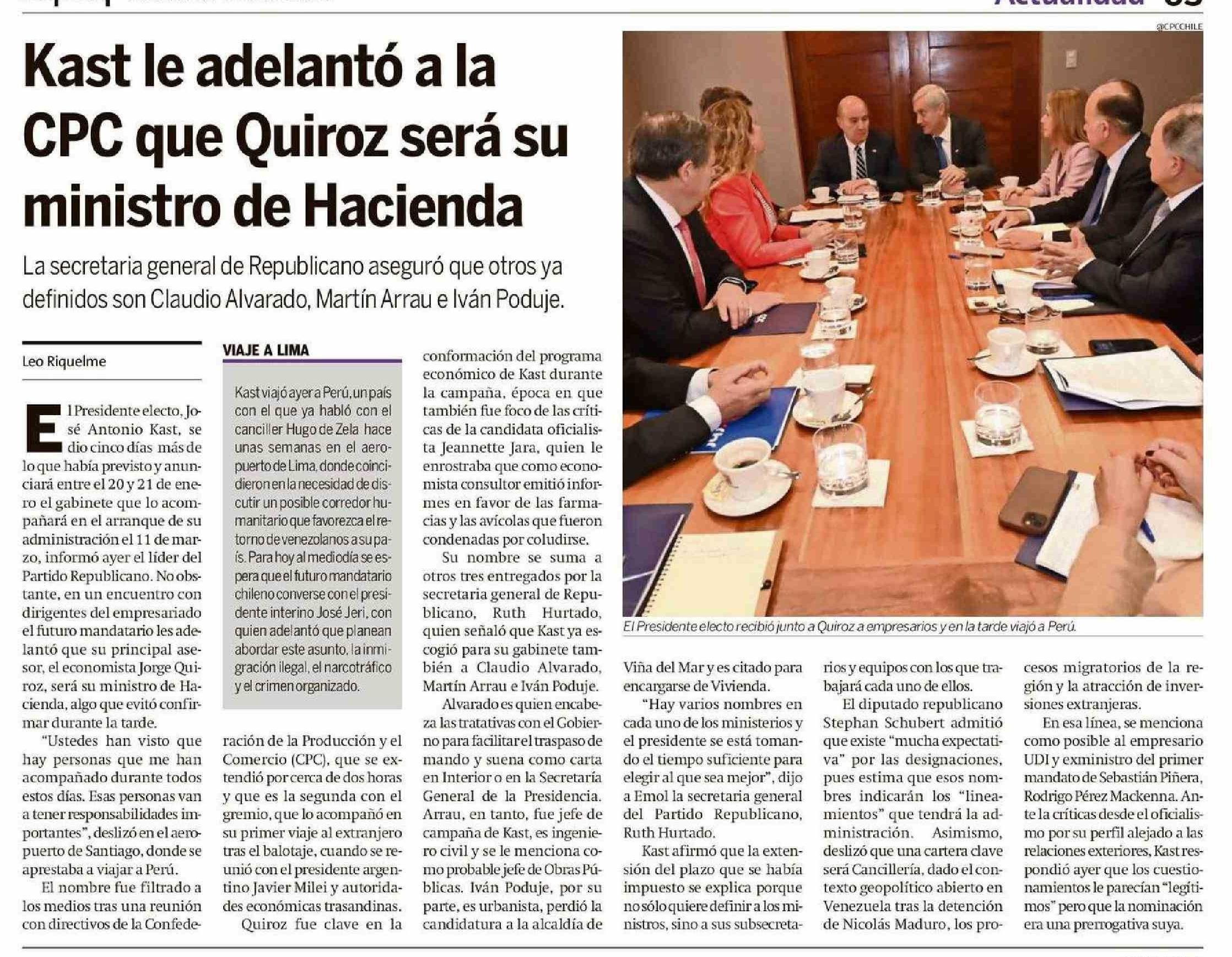 Kast le adelantó a la CPC que Quiroz será su ministro de Hacienda