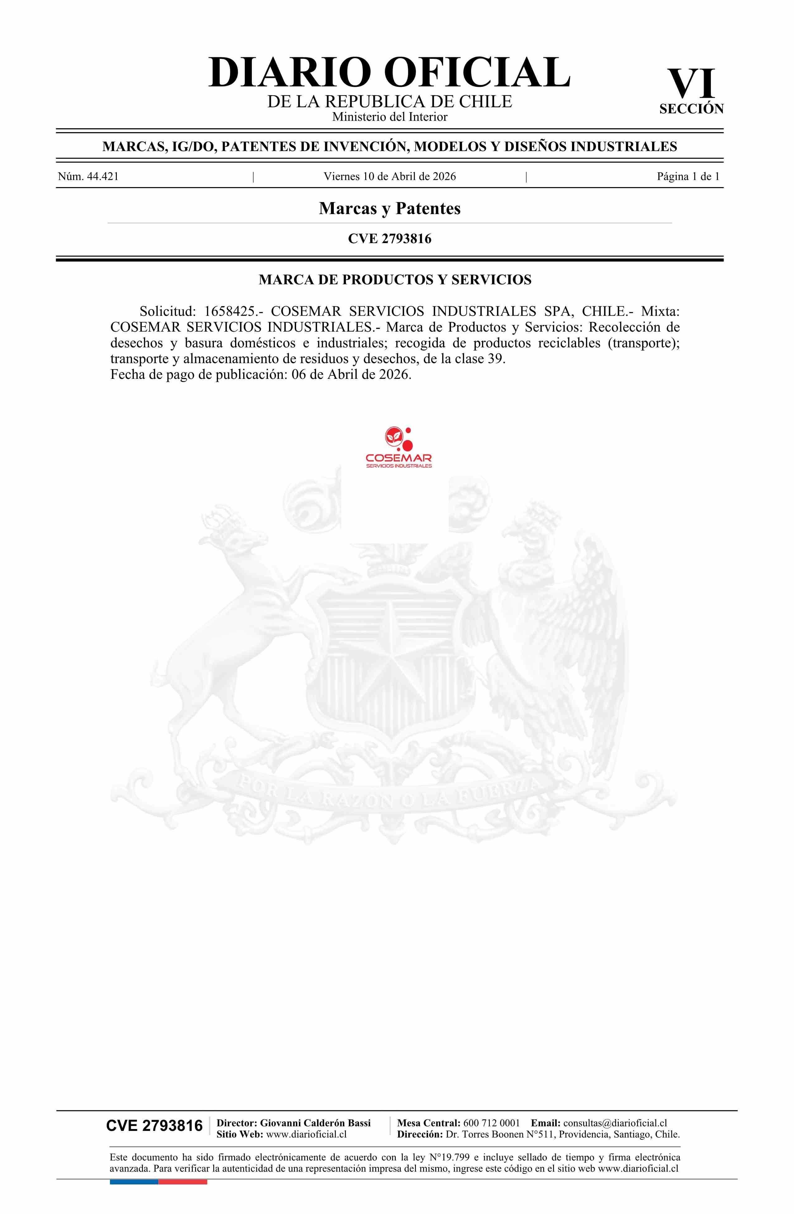 Diario Oficial Edición Electrónica (Diario Oficial de Chile - 6 Marcas Y Patentes)