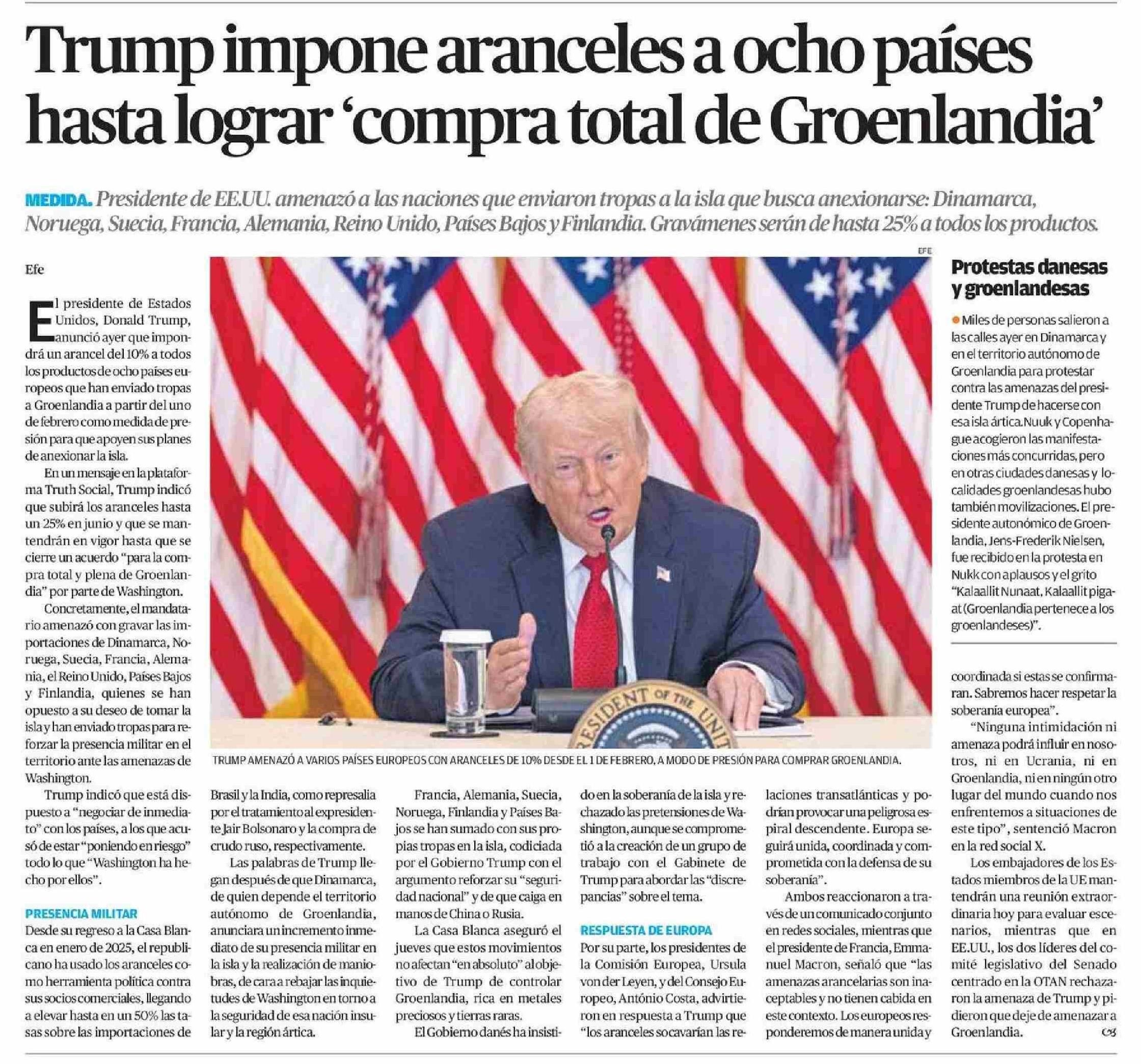 Trump impone aranceles a ocho países hasta lograr 'compra total de Groenlandia'
