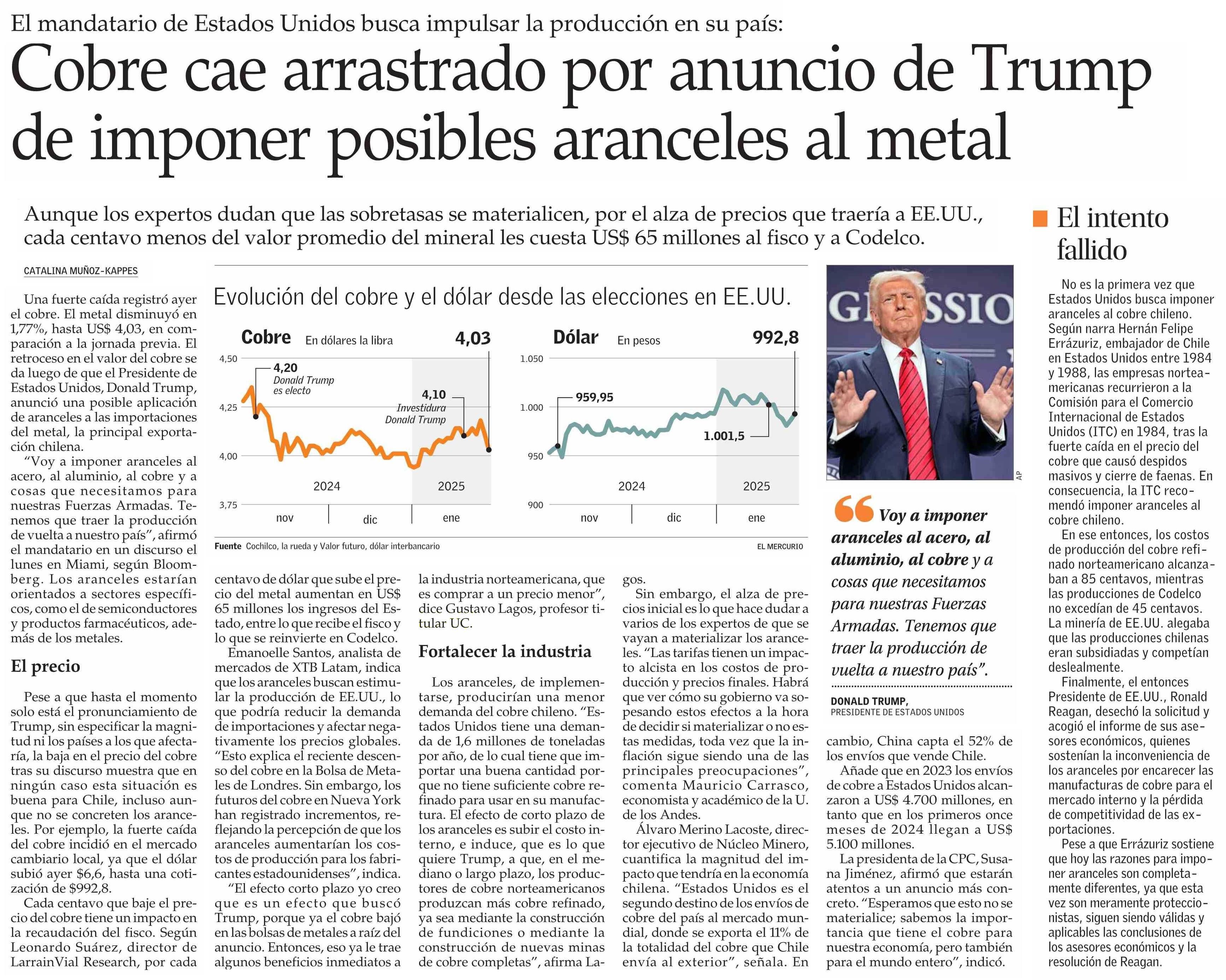 Cobre cae arrastrado por anuncio de Irump de imponer posibles aranceles al metal