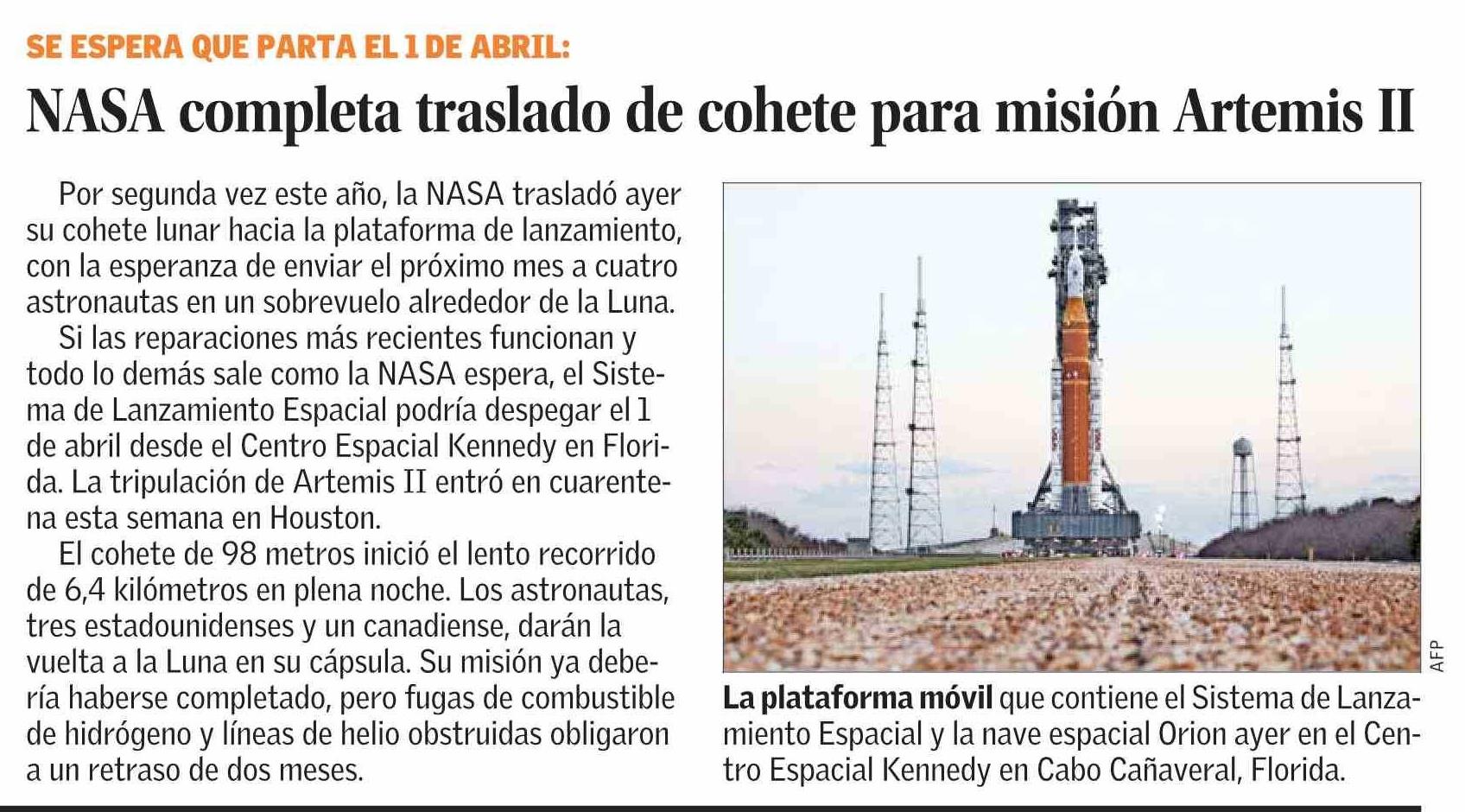 NASA completa traslado de cohete para misión Artemis II