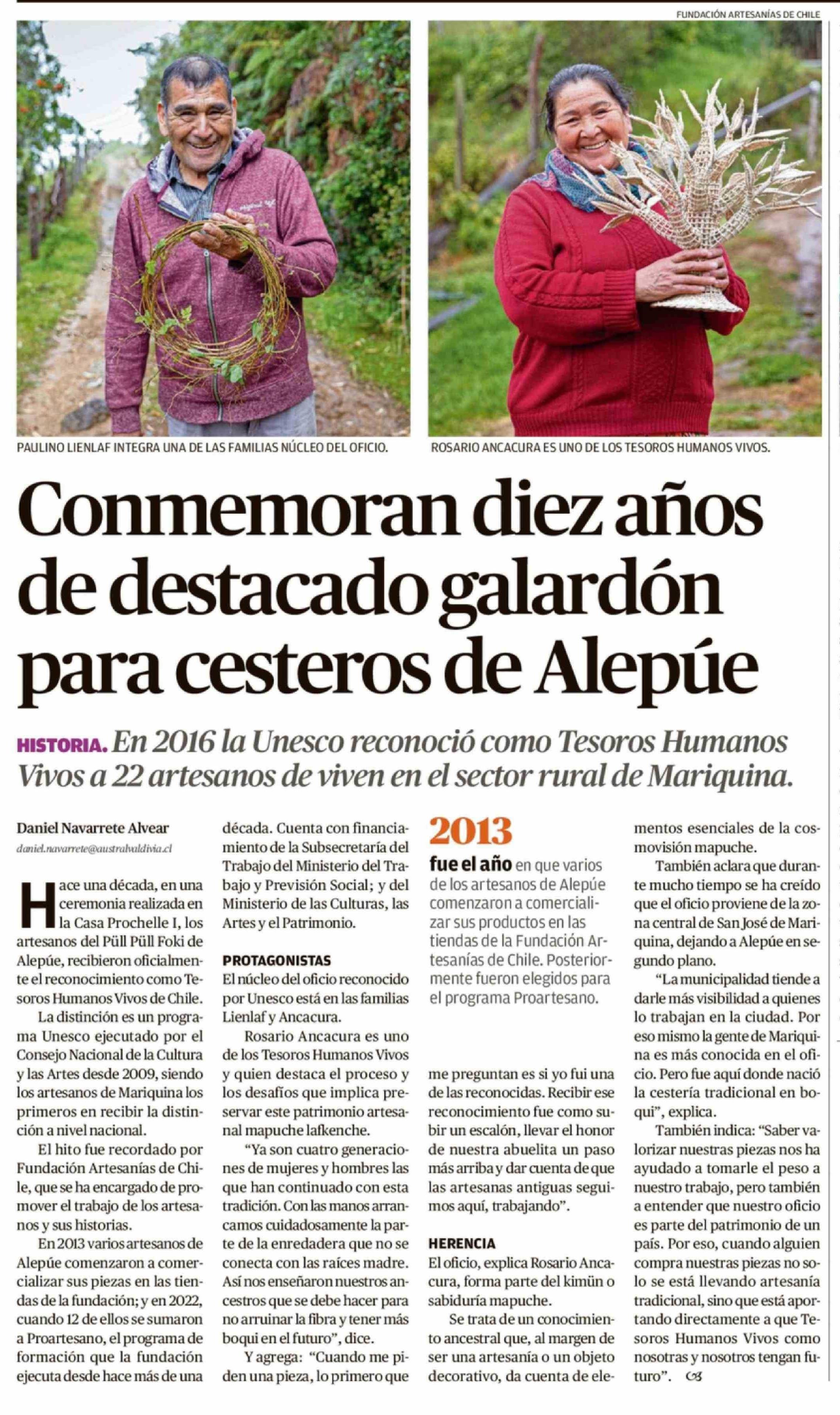 Conmemoran diez años de destacado galardón para cesteros de Alepúe