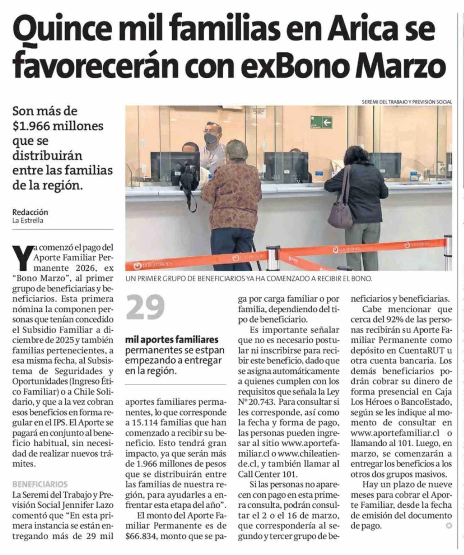 Quince mil familias en Arica se favorecerán con exBono Marzo