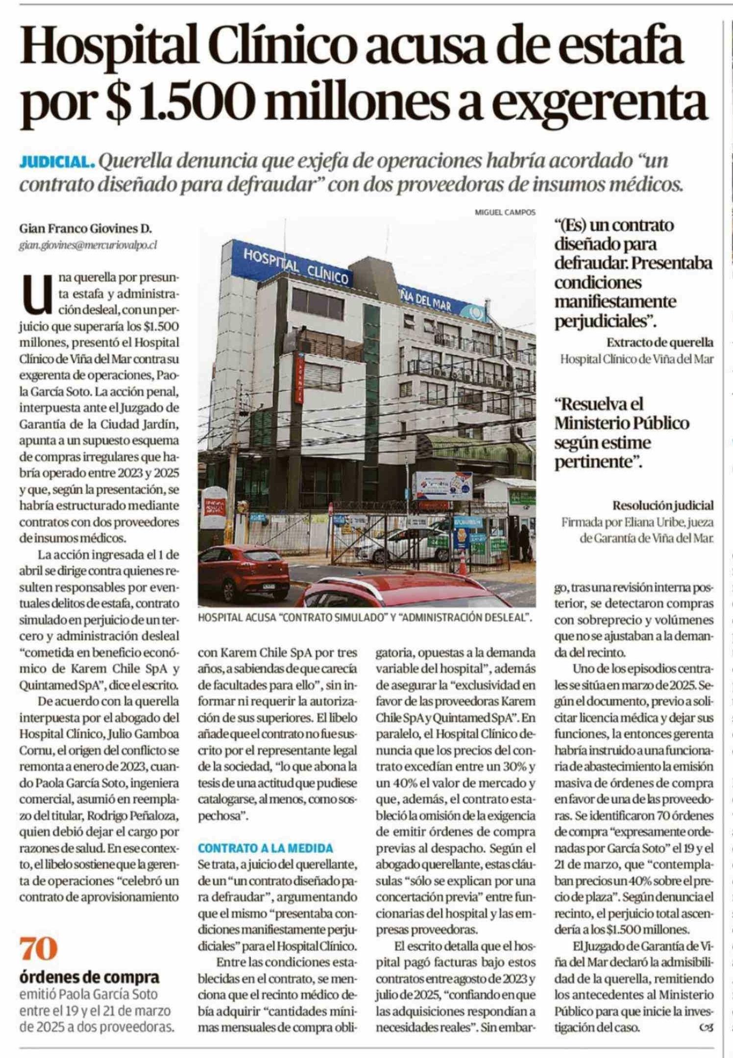 Título: Hospital Clínico acusa de estafa por $ 1.500 millones a exgerenta