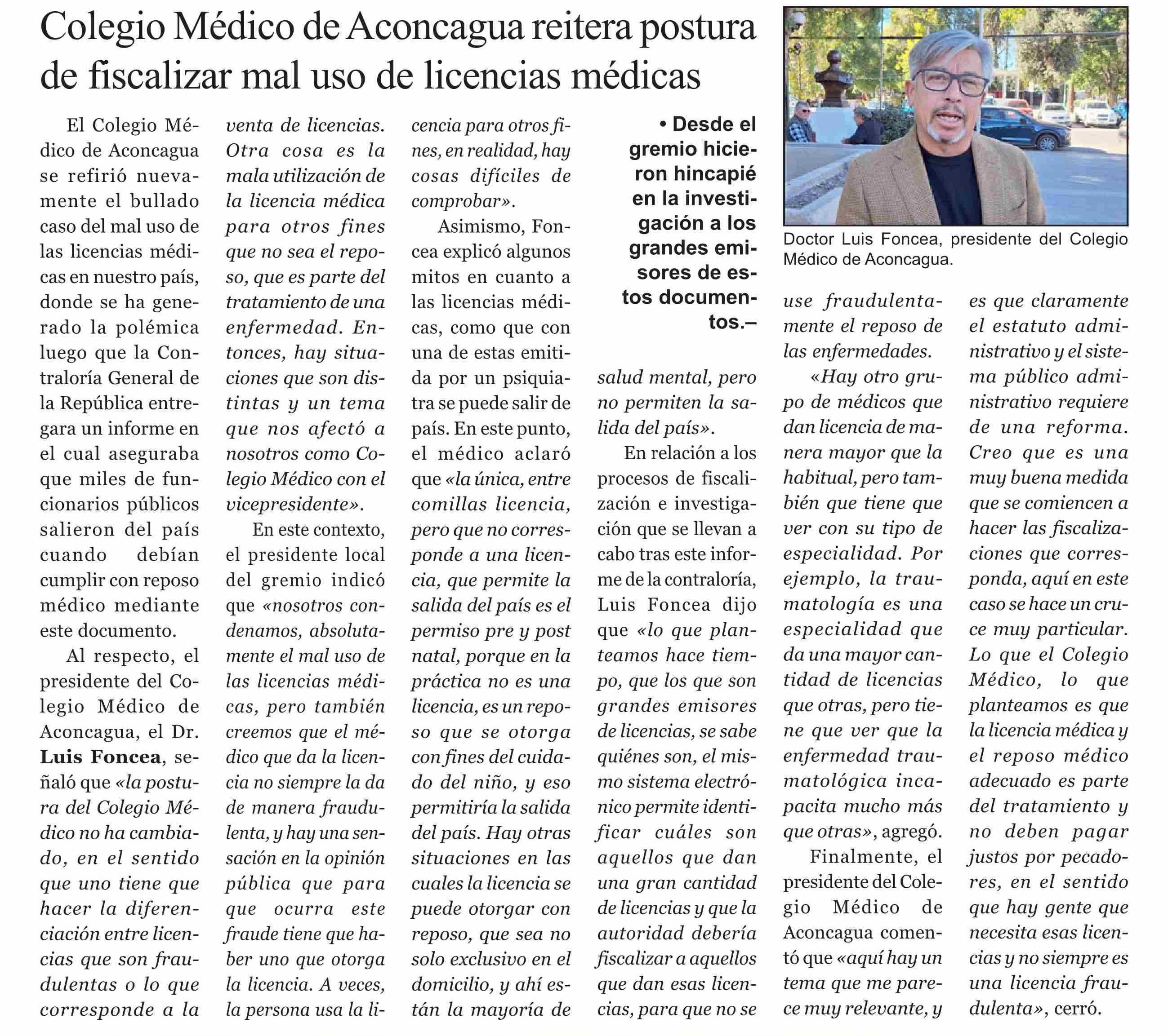 Colegio Médico de Aconcagua reitera postura de fiscalizar mal uso de licencias médicas