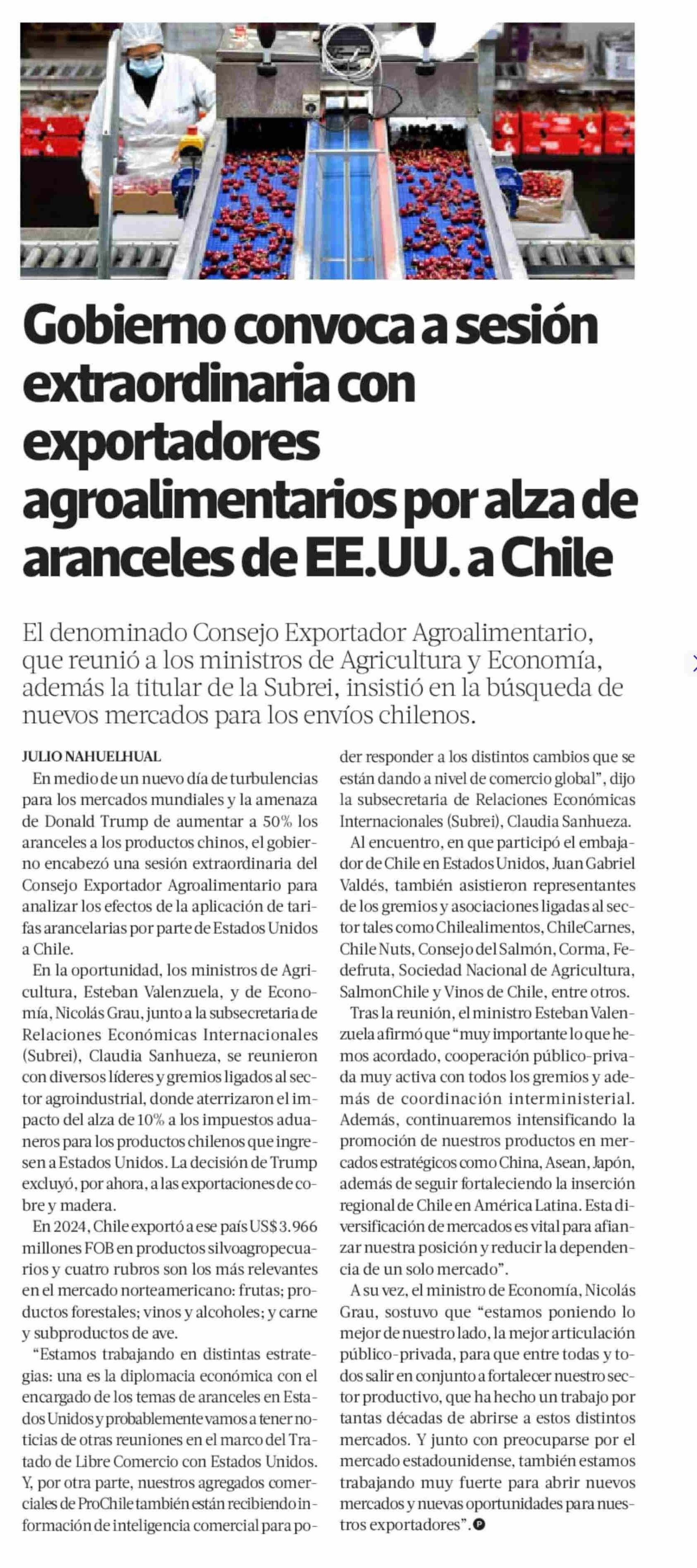 Título: Gobiemo convoca a sesión extraordinanía con exportadores agroalimentarios por alza de aranceles de EE.UU. a Chile