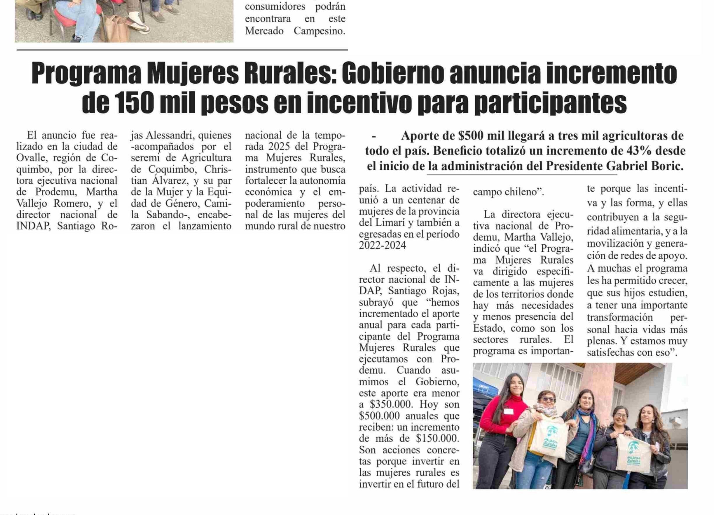 Programa Mujeres Rurales: Gobierno anuncia incremento de 150 mil pesos en incentivo para participantes