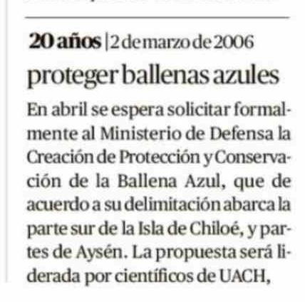| Título: | 20 años |2 demarzo de 2006 proteger ballenas azules En abril se espera solicitar formalmente al Ministerio de Defensa la Creación de Protección y Conservación de la Ballena Azul, que de acuerdo a su delimitación abarca la parte sur de la Isla de Chiloé, y partes de Aysén. La propuesta será liderada |