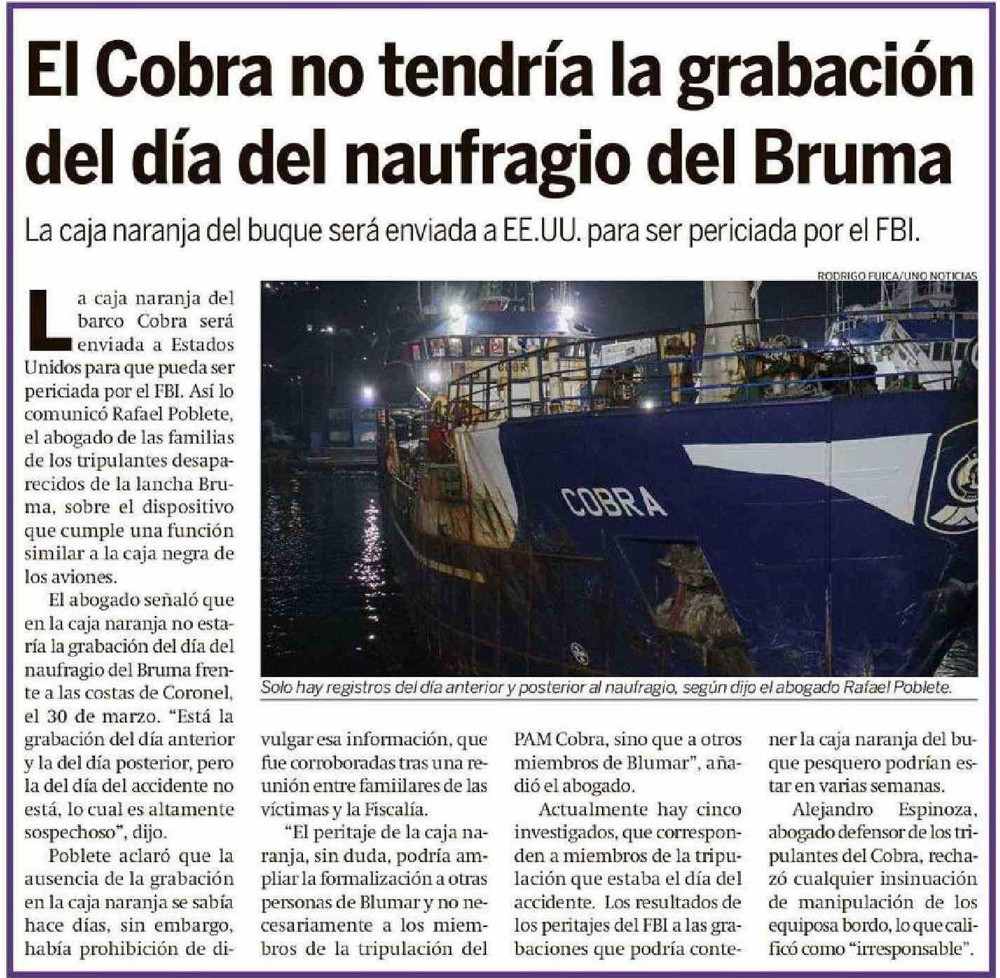 El Cobra no tendría la grabación del día del naufragio del Bruma