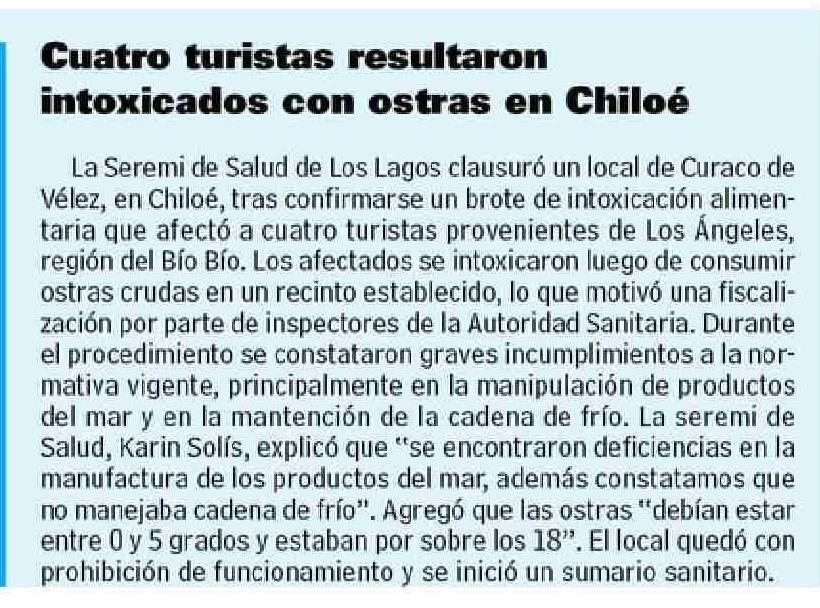Cuatro turistas resultaron intoxicados con ostras en Chiloé