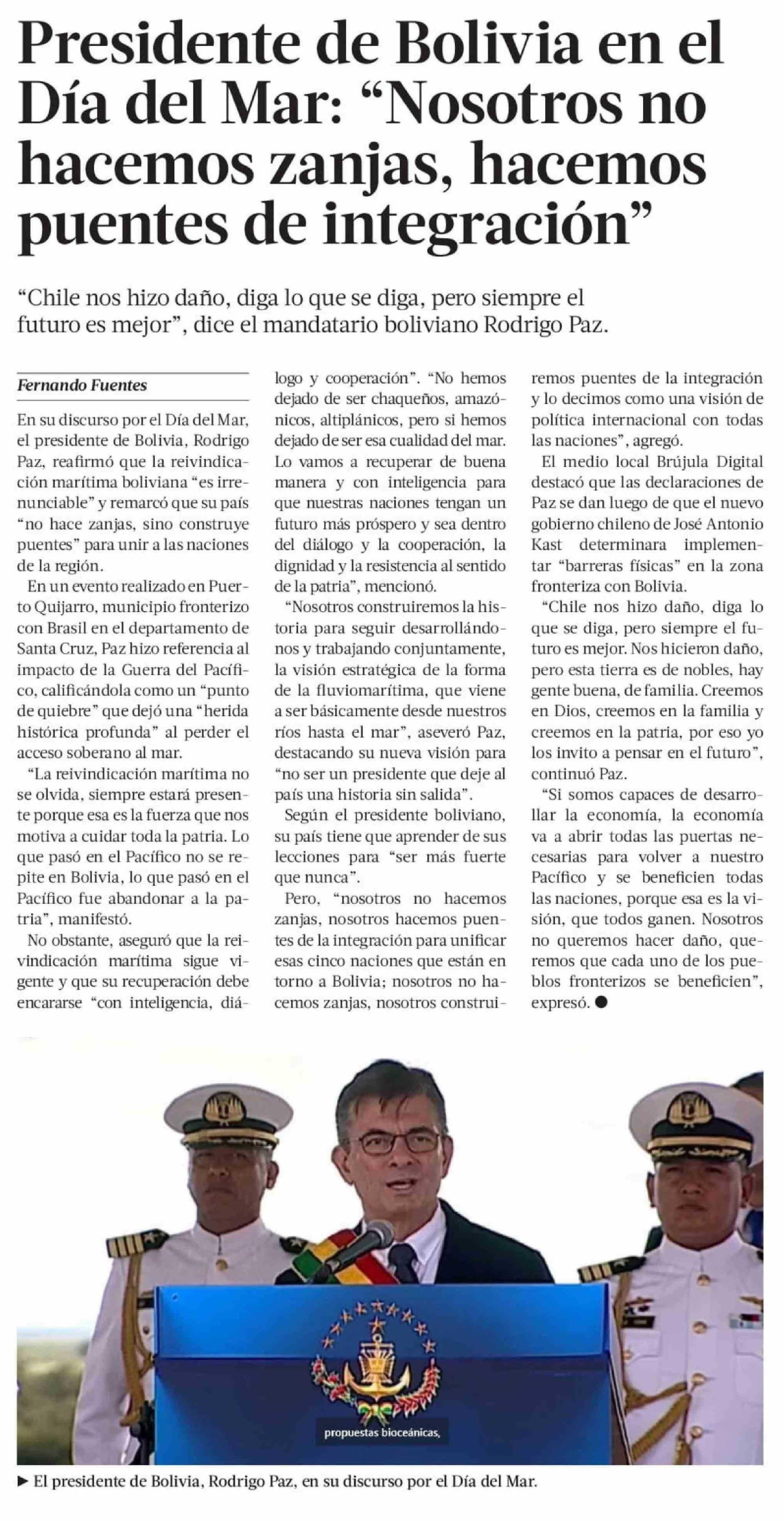 Presidente de Bolivia en el Día del Mar: "Nosotros no hacemos zanjas, hacemos puentes de integración"