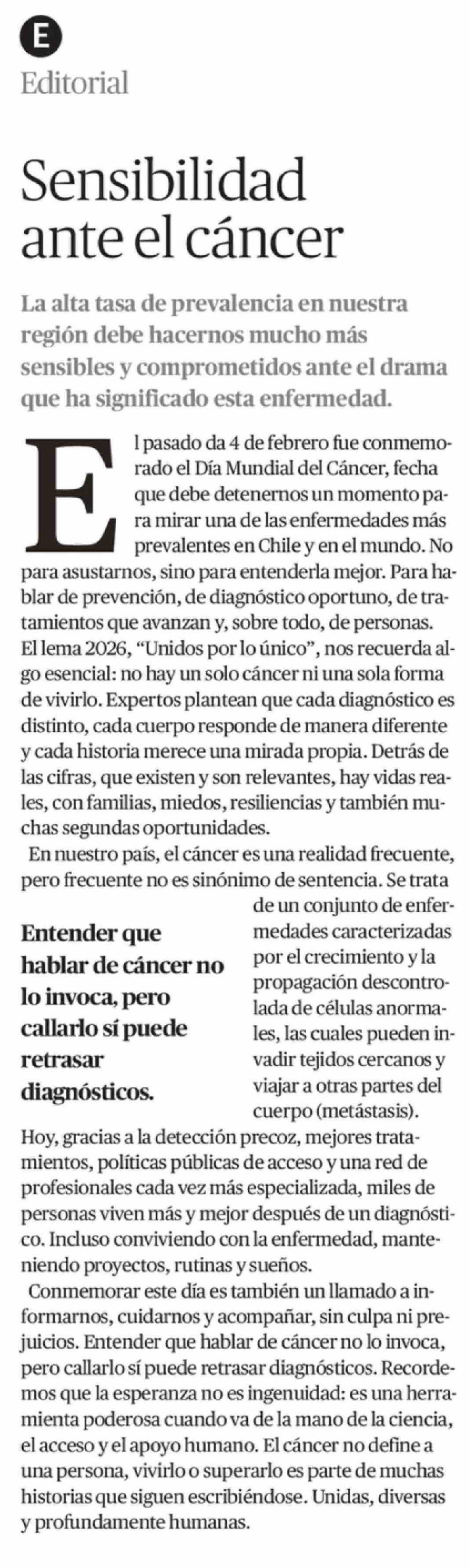 Editorial: Sensibilidad ante el cáncer