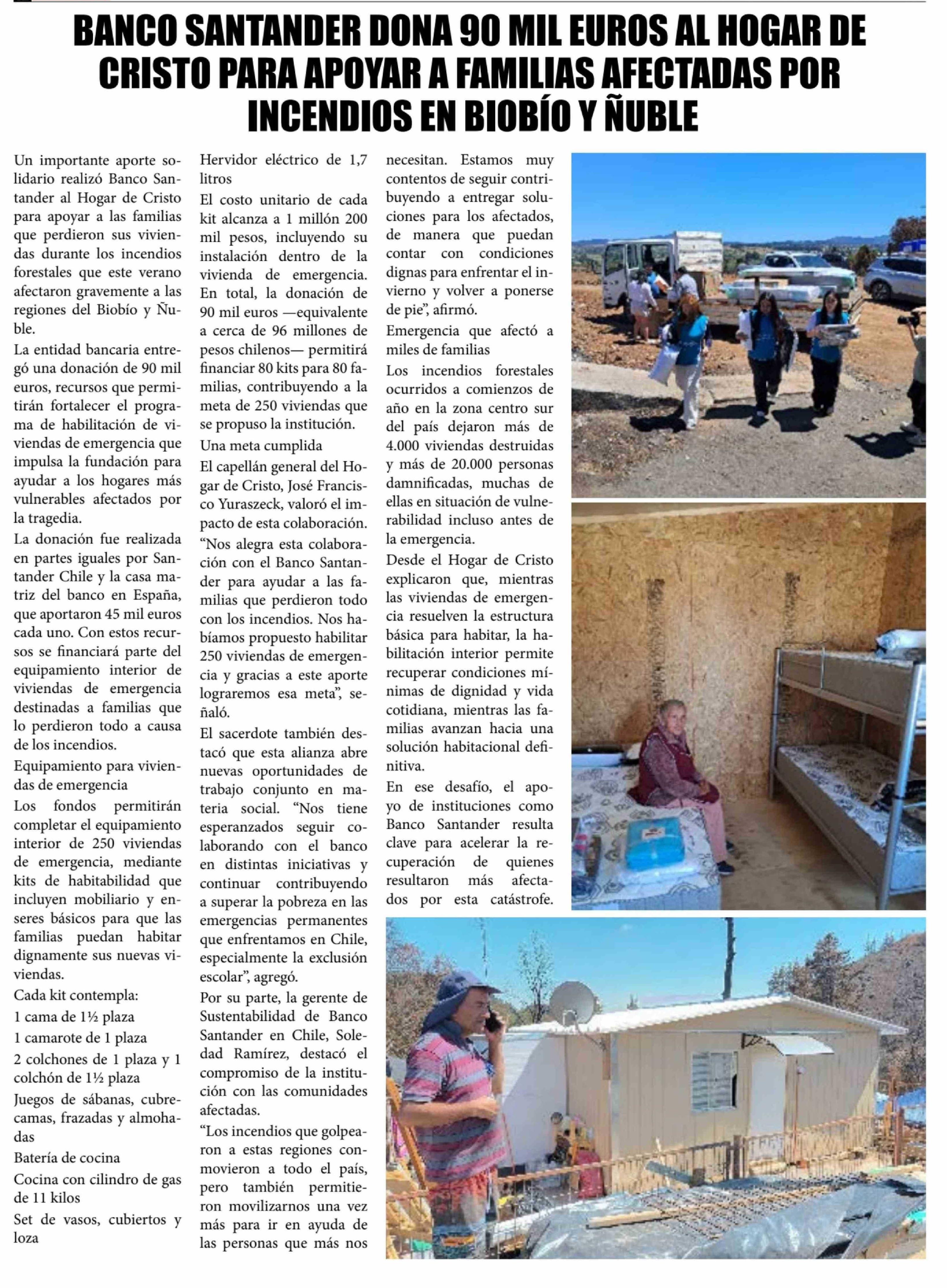 BANCO SANTANDER DONA 90 MIL EUROS AL HOGAR DE CRISTO PARA APOYAR A FAMILIAS AFECTADAS POR INCENDIOS EN BIOBÍO Y ÑUBLE
