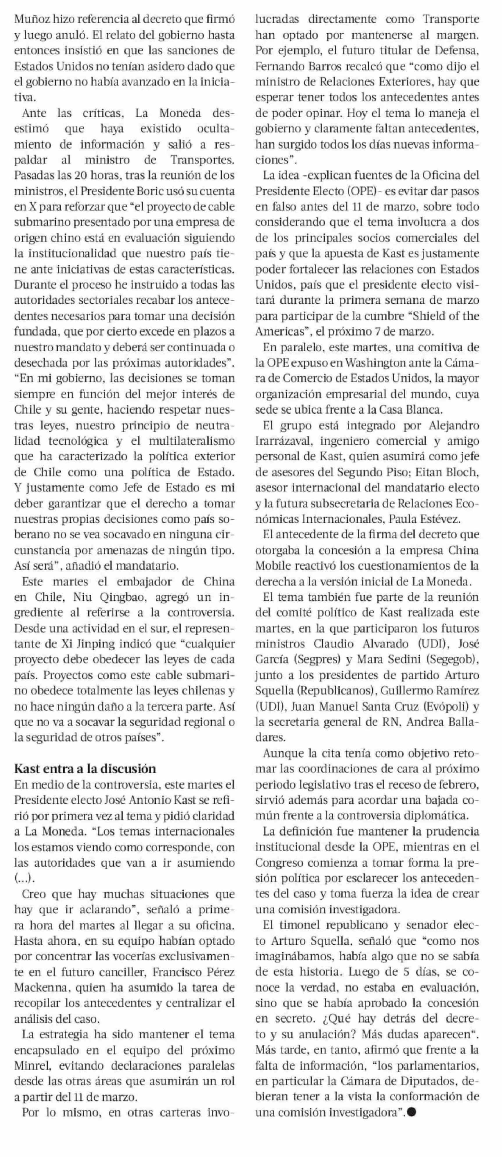 Cable submarino: La Moneda niega ocultamiento de información y Kast pide aclarar el episodio