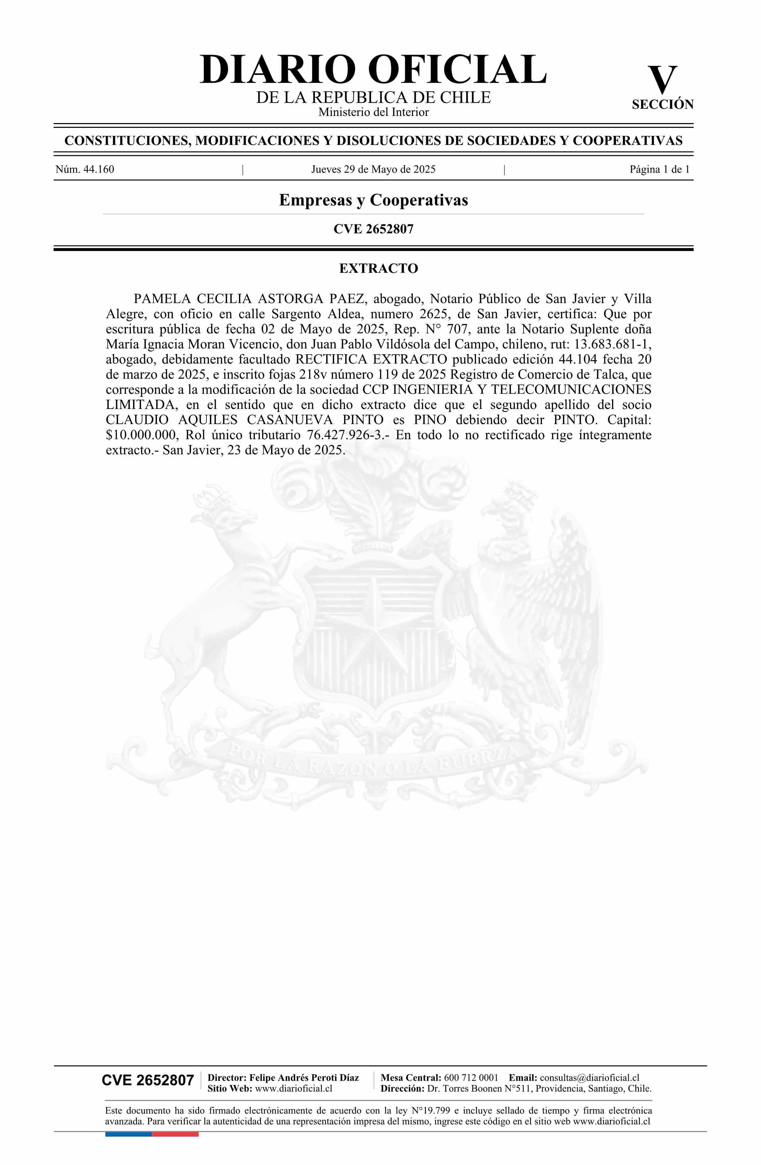 CCP INGENIERÍA Y TELECOMUNICACIONES LIMITADA 76.427.926-3*