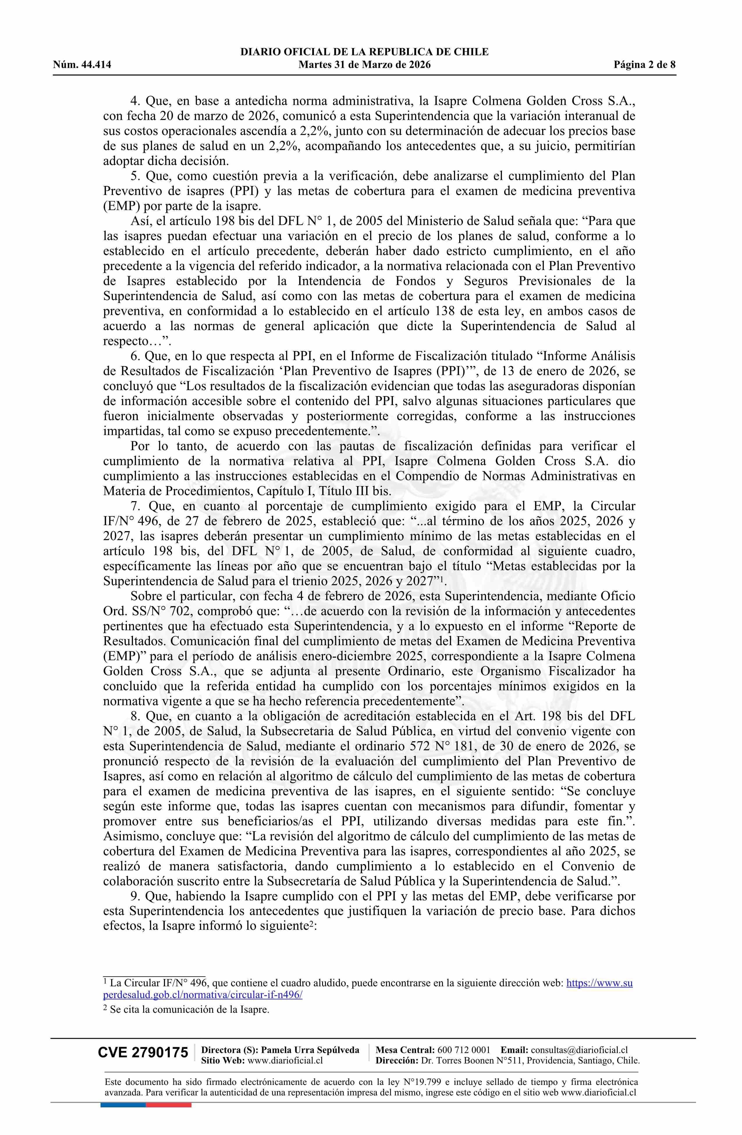 | Título: | Resolución exenta número IF 3.124, de 2026.- Autoriza ajuste de los precios base de los planes de salud de la Isapre Colmena Golden Cross |