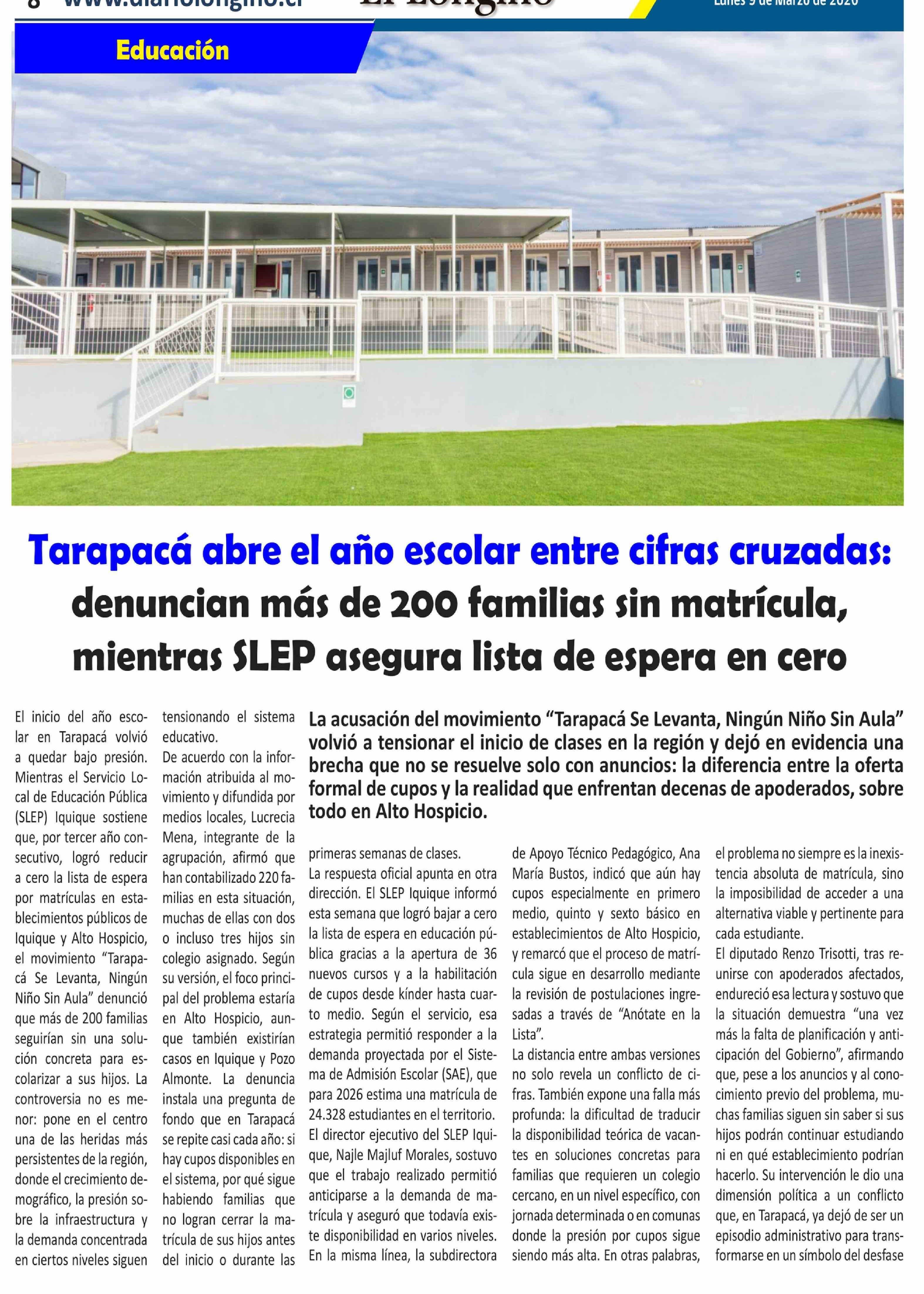 Tarapacá abre el año escolar entre cifras cruzadas: denuncian más de 200 familias sin matrícula, mientras SLEP asegura lista de espera en cero