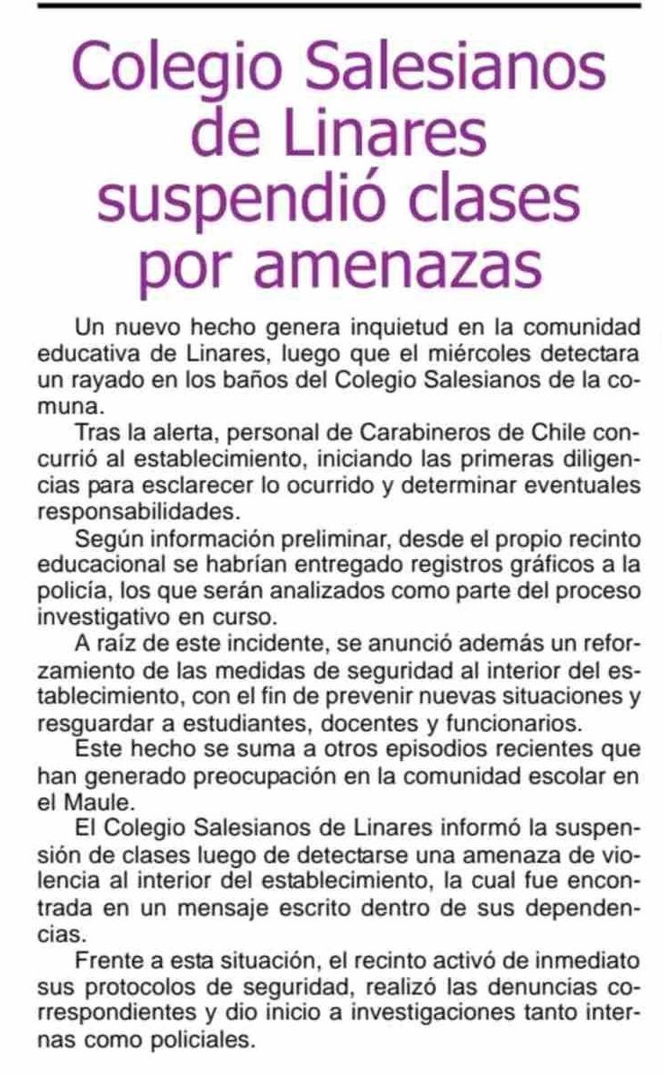 Colegio Salesianos de Linares suspendió clases por amenazas