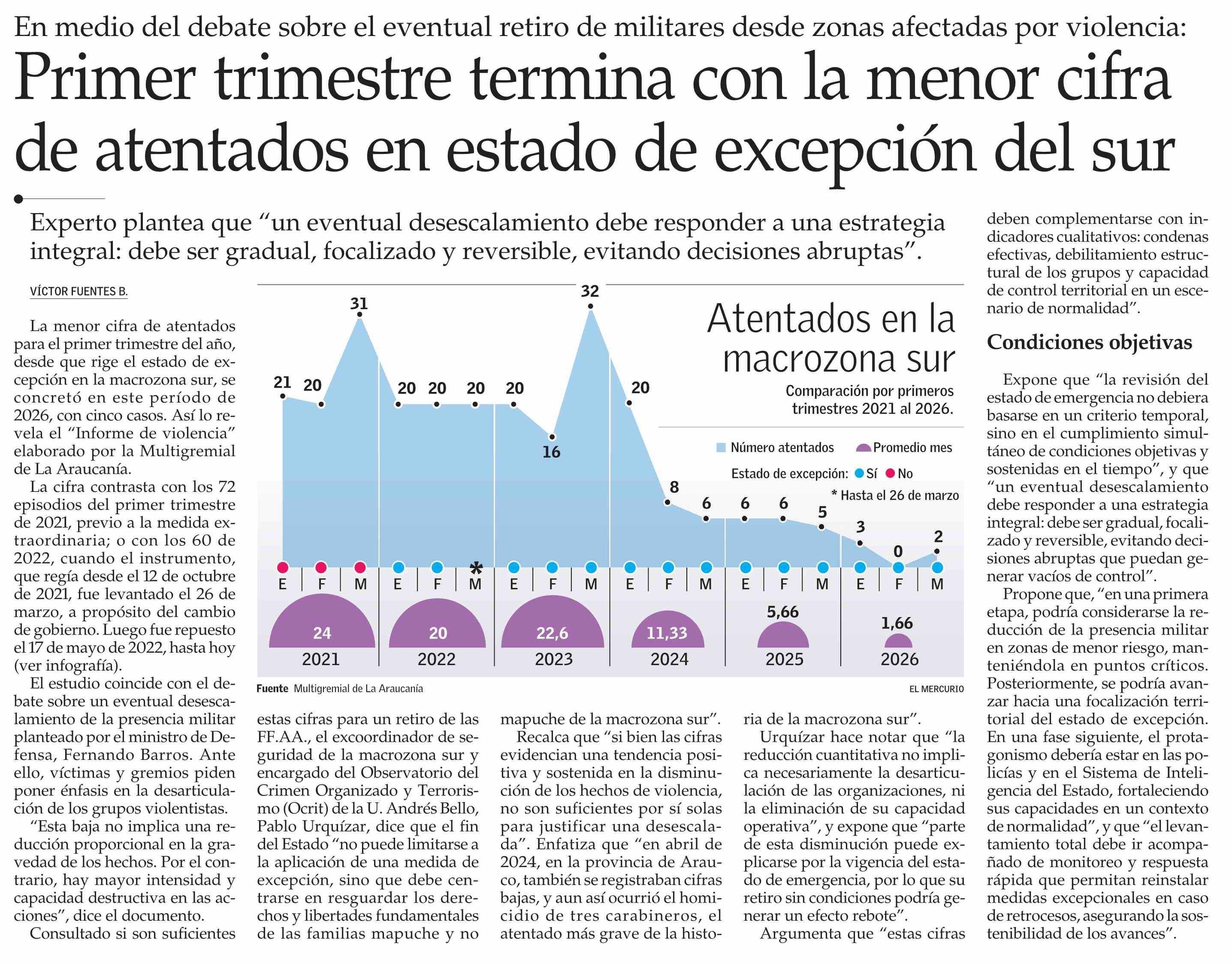 Primer trimestre termina con la menor cifra de atentados en estado de excepción del sur