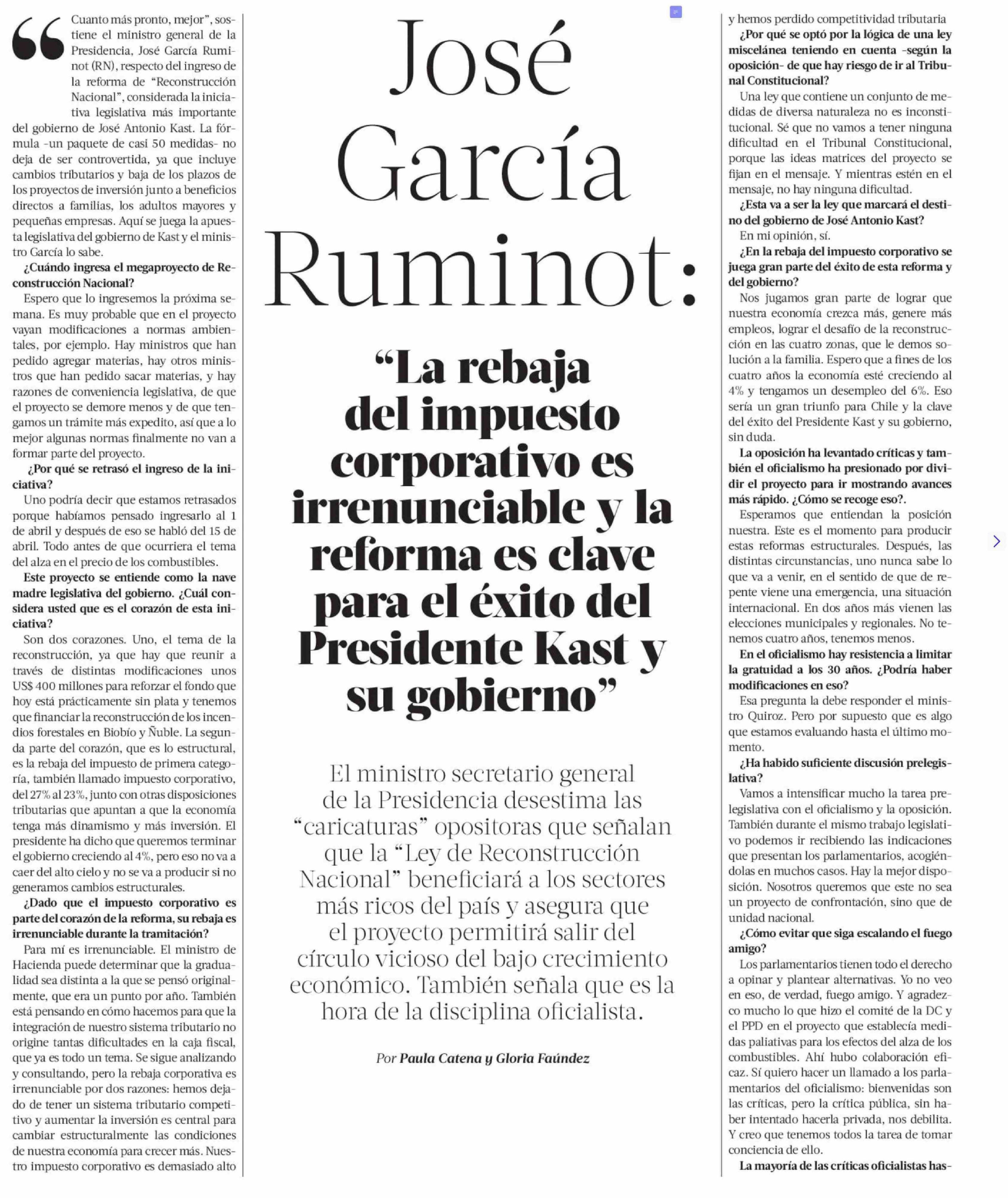 | Título: | José García Ruminot: "La rebaja del impuesto corporativo es irrenunciable y la reforma es clave para el éxito del Presidente Kast y su gobierno" |