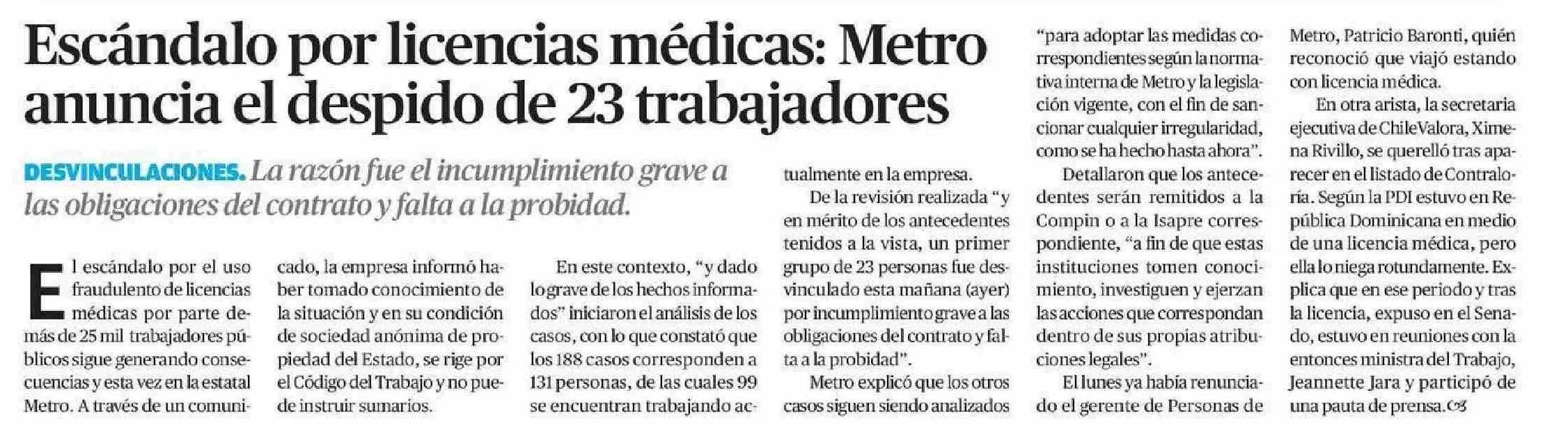 Escándalo por licencias médicas: Metro anuncia el despido de 23 trabajadores