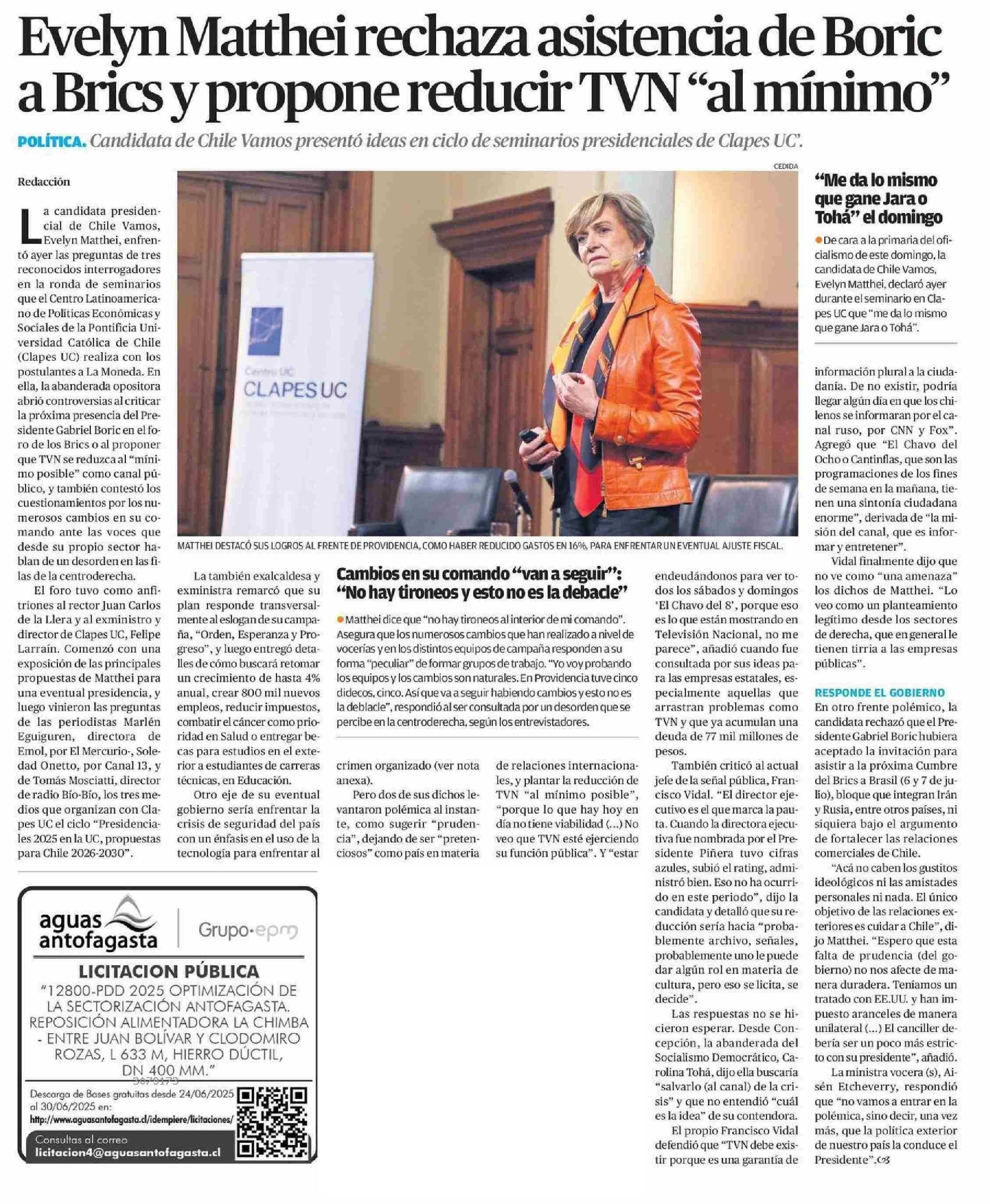 Evelyn Matthei rechaza asistencia de Boric a Brics y propone reducir TVN “al mínimo”