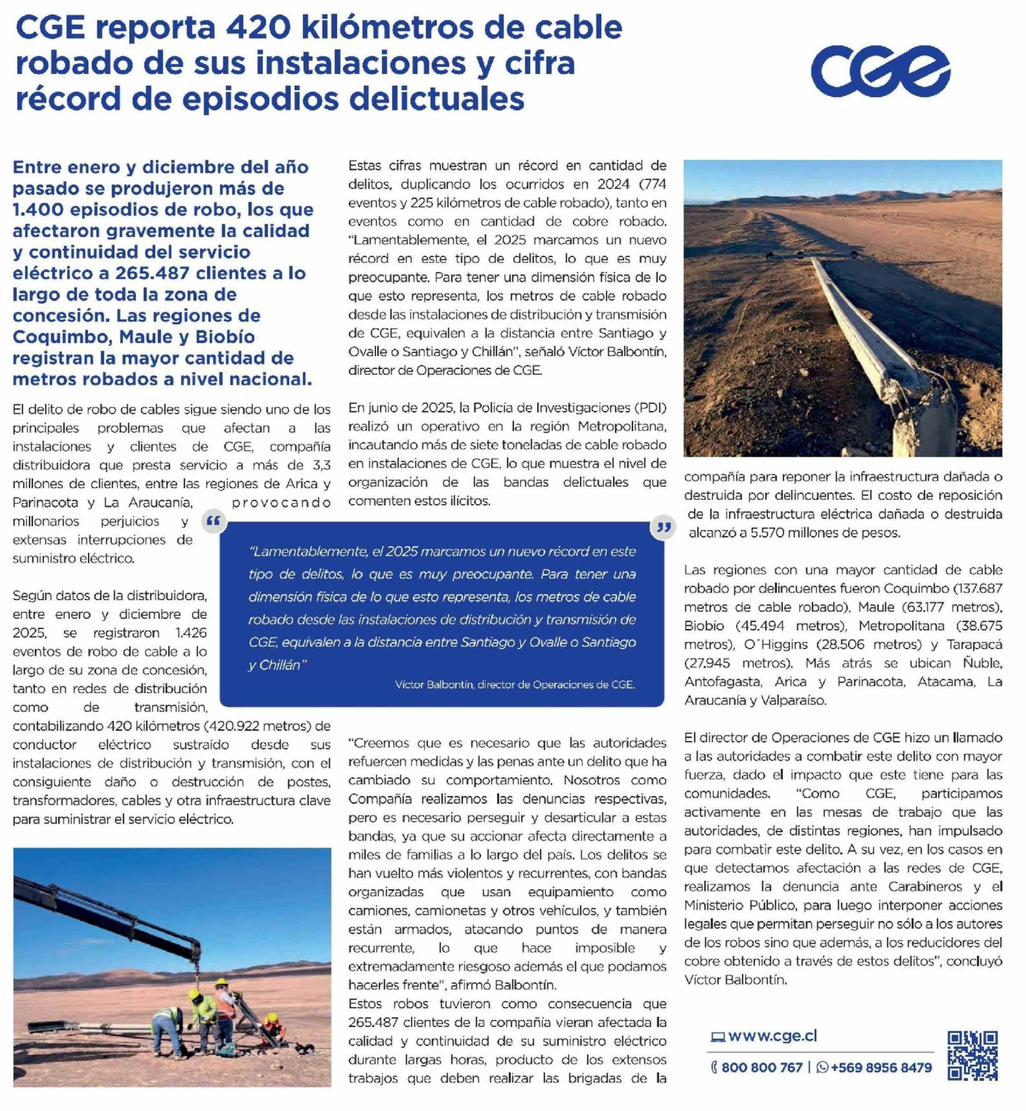 CGE reporta 420 kilómetros de cable robado de sus instalaciones y cifra récord de episodios delictuales