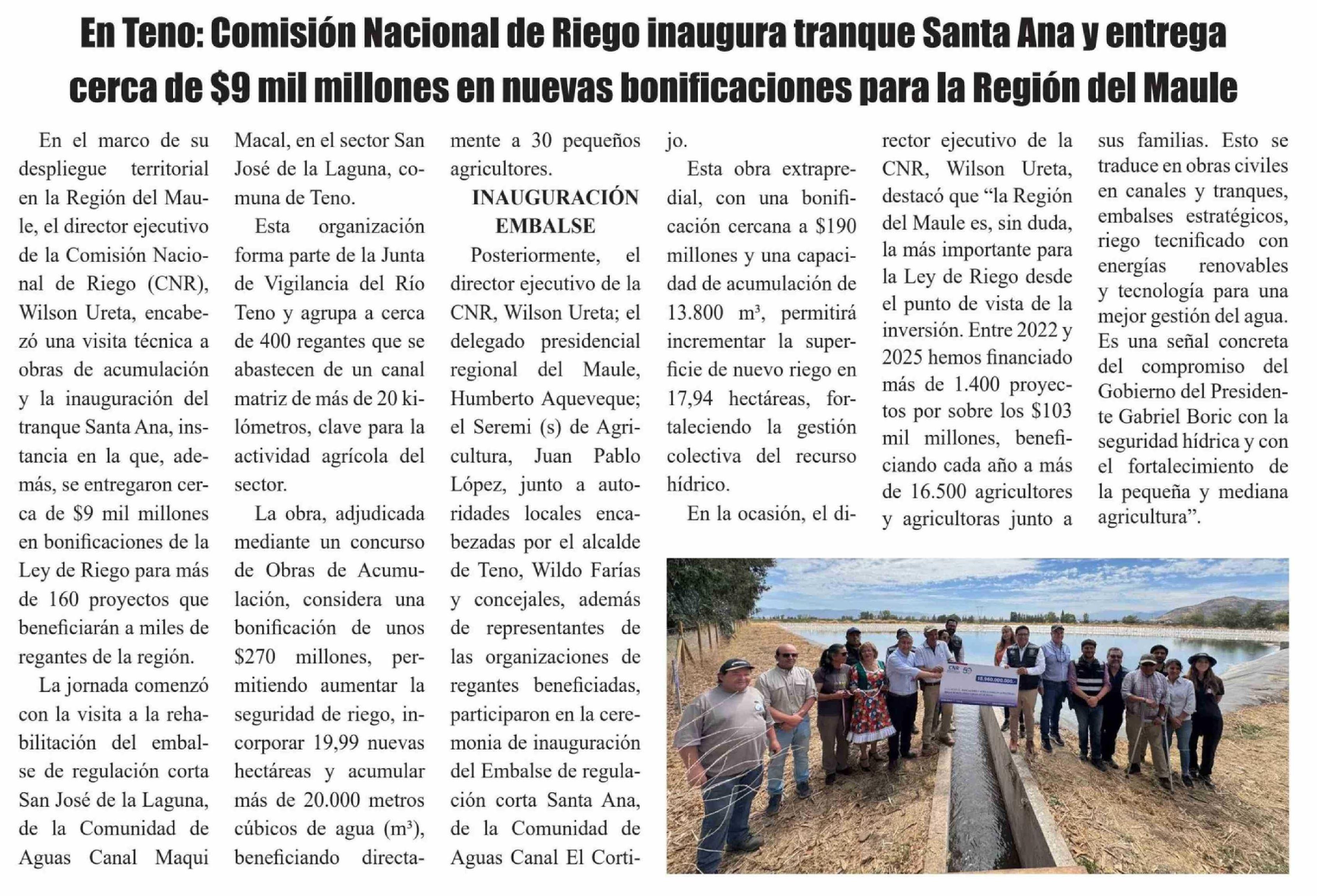 En Teno: Comisión Nacional de Riego inaugura tranque Santa Ana y entrega cerca de $9 mil millones en nuevas bonificaciones para la Región del Maule