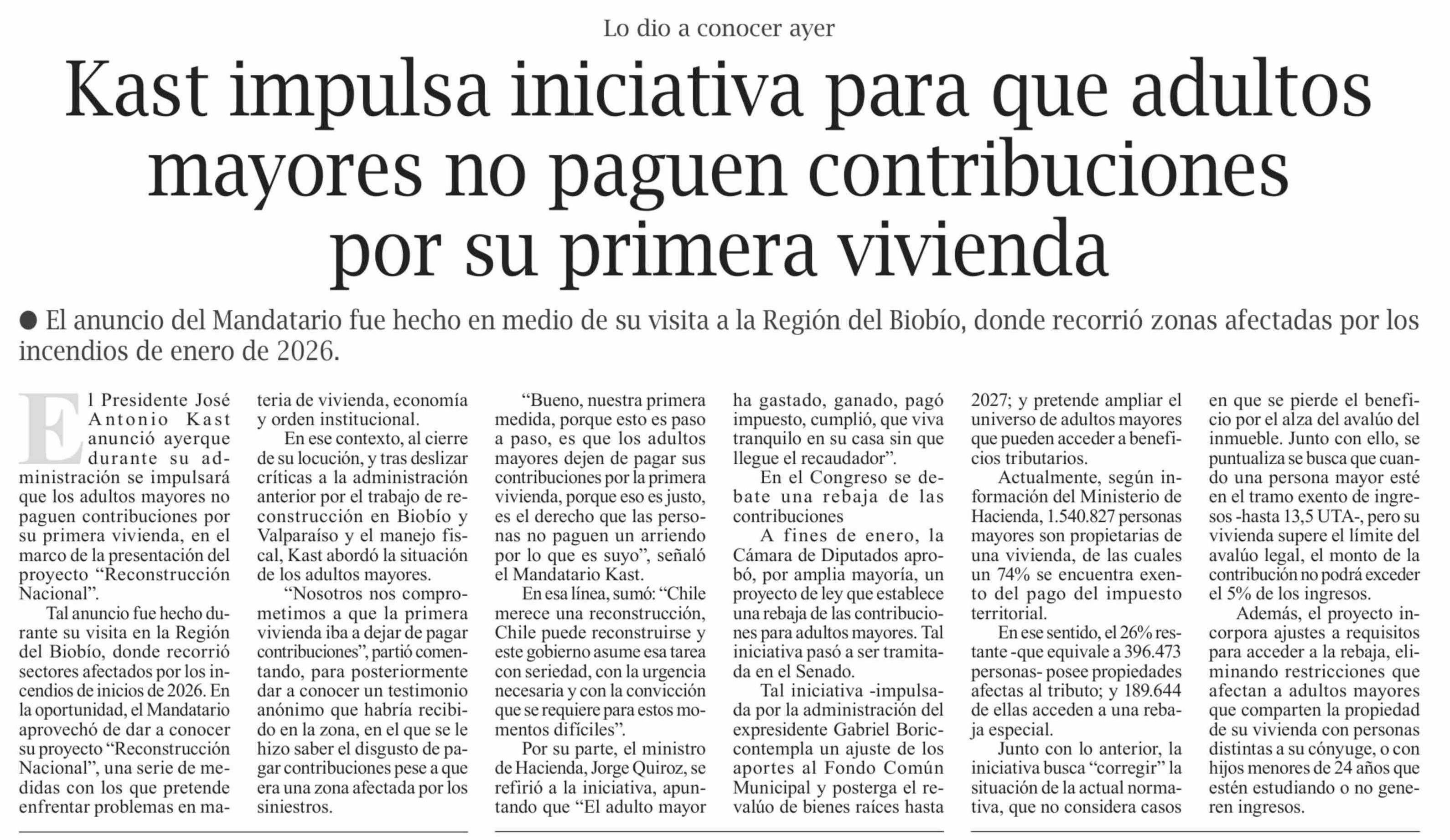 Kast impulsa iniciativa para que adultos mayores no paguen contribuciones por su primera vivienda