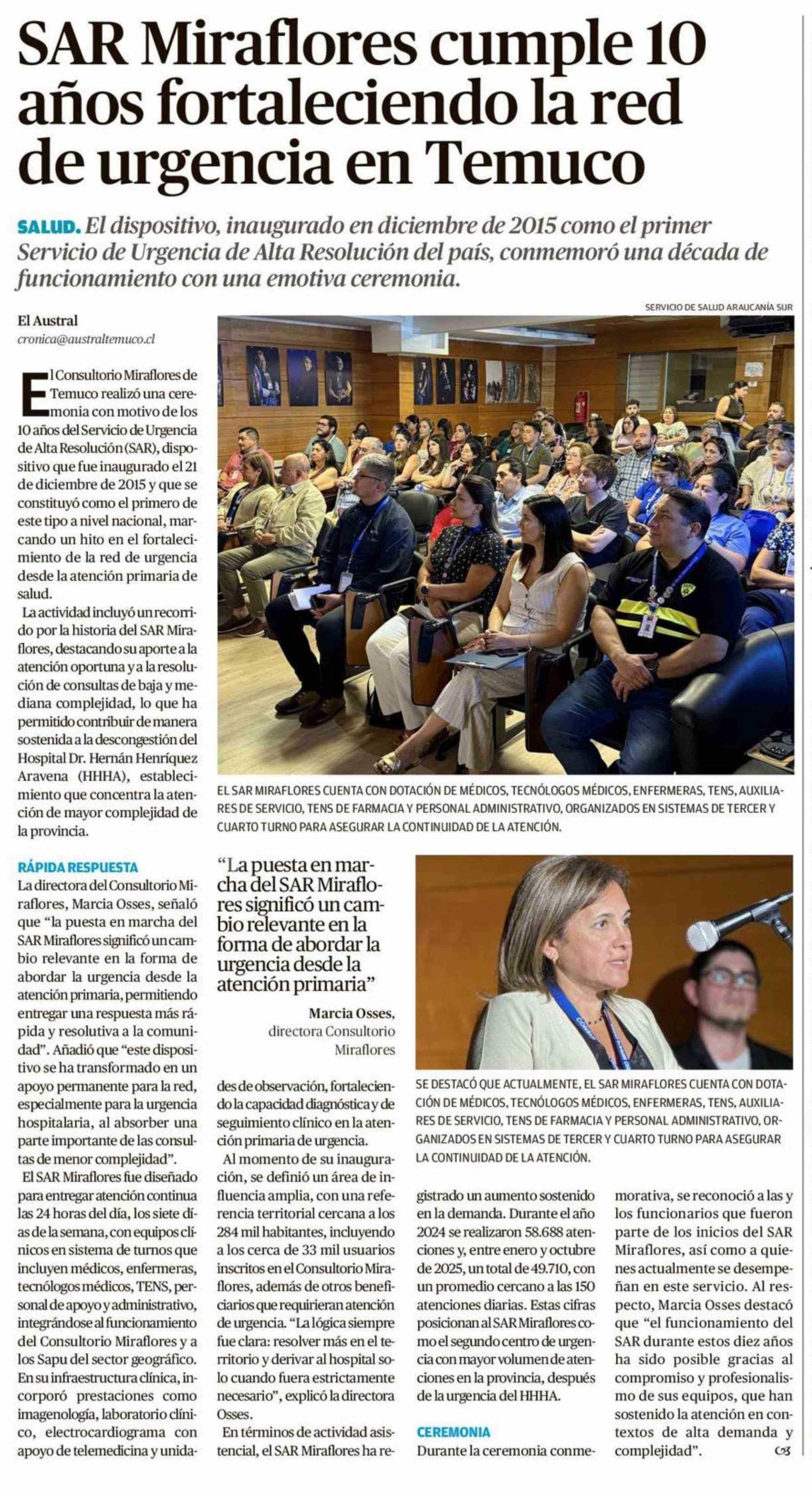 SAR Miraflores cumple 10 años fortaleciendo la red de urgencia en Temuco