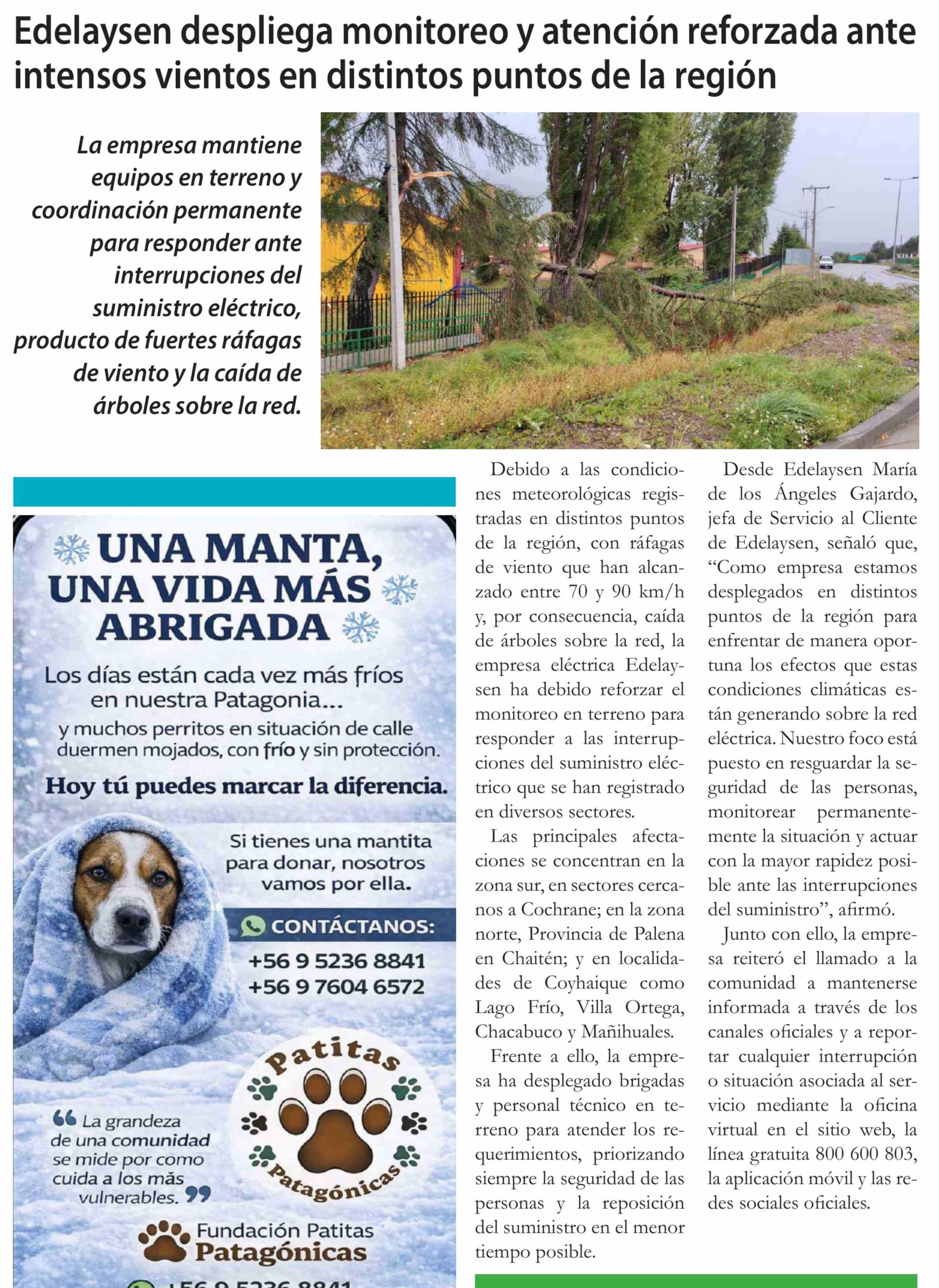 Edelaysen despliega monitoreo y atención reforzada ante intensos vientos en distintos puntos de la región