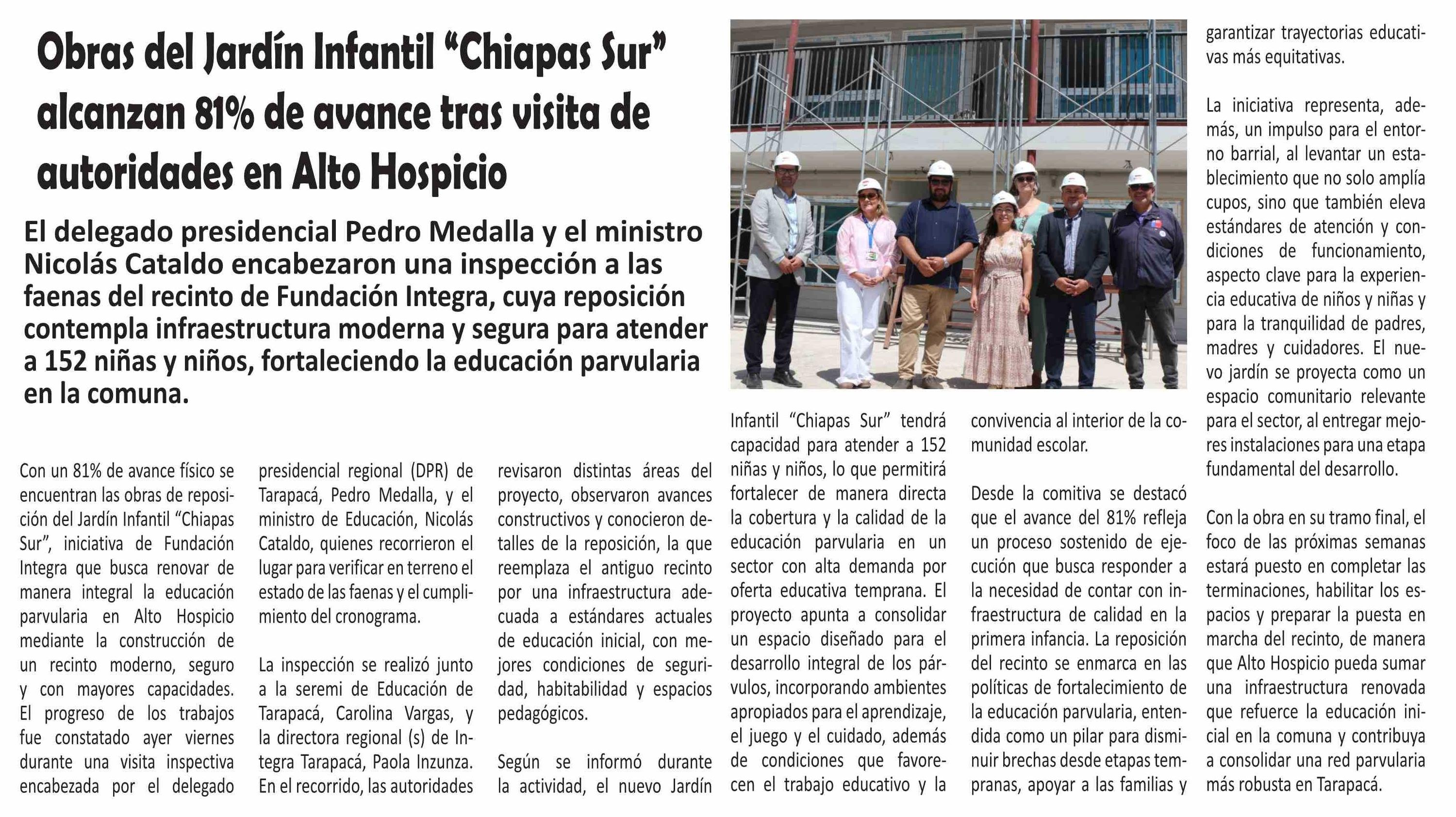 Obras del Jardín Infantil "Chiapas Sur" alcanzan 81% de avance tras visita de autoridades en Alto Hospicio