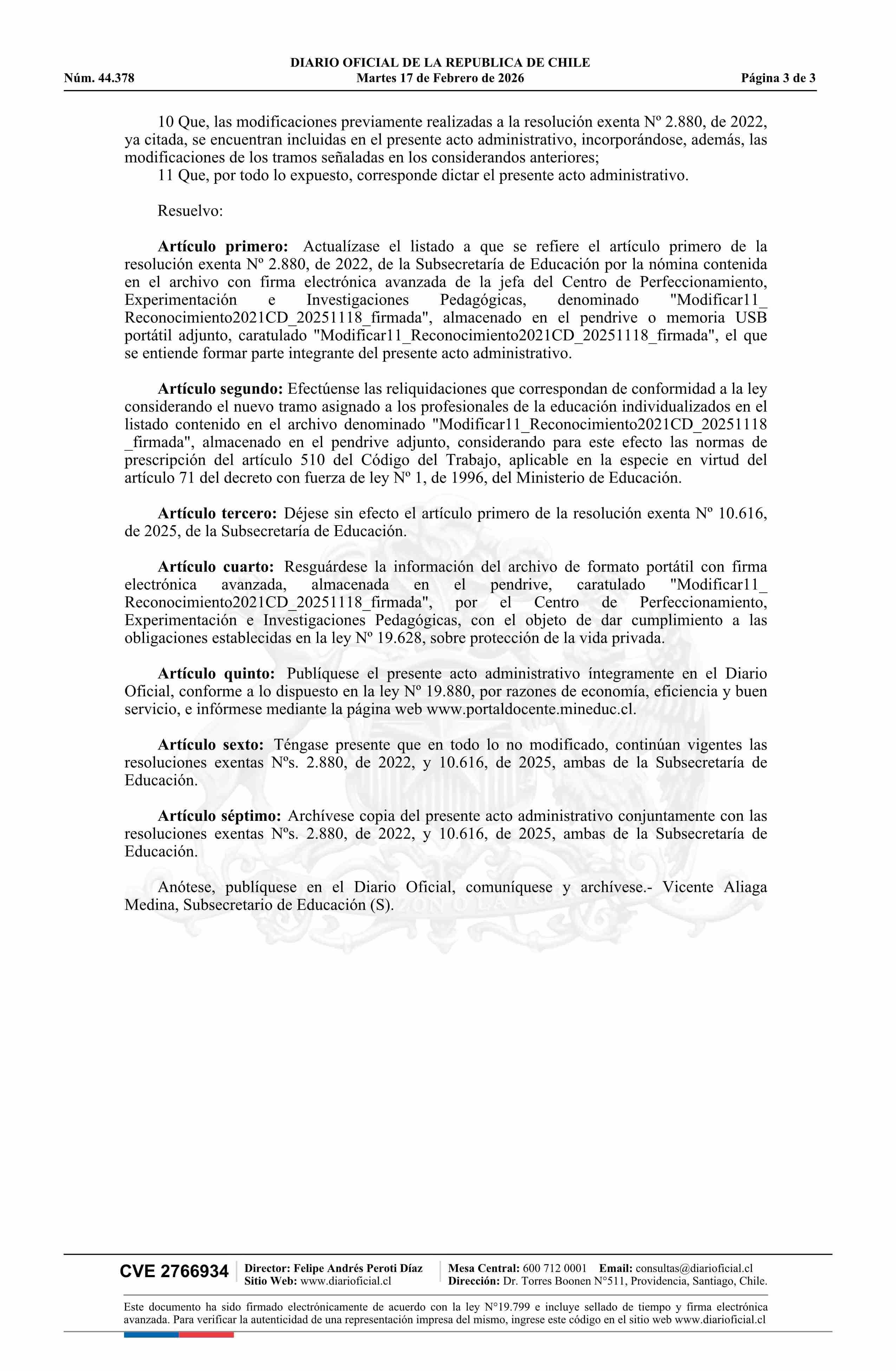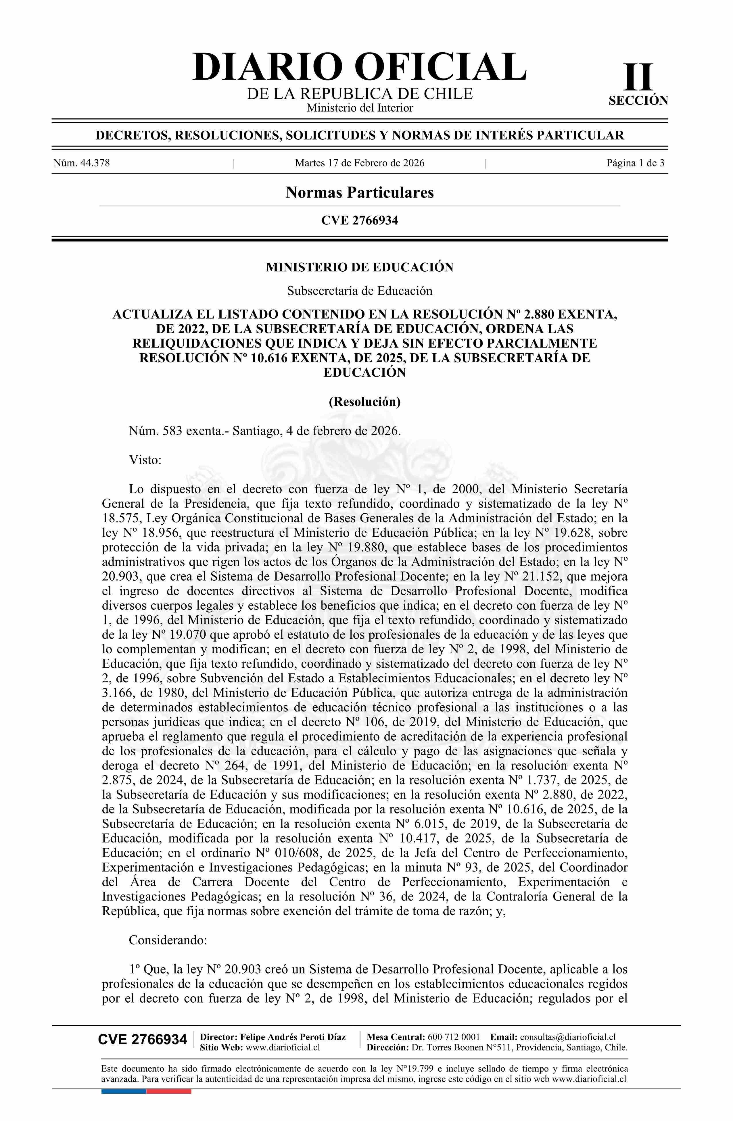 Título: Resolución exenta número 583, de 2026.- Actualiza el listado contenido en la resolución Nº 2.880 exenta, de 2022, ordena las reliquidaciones que indica y deja sin efecto parcialmente resolución Nº 10.616 exenta, de 2025