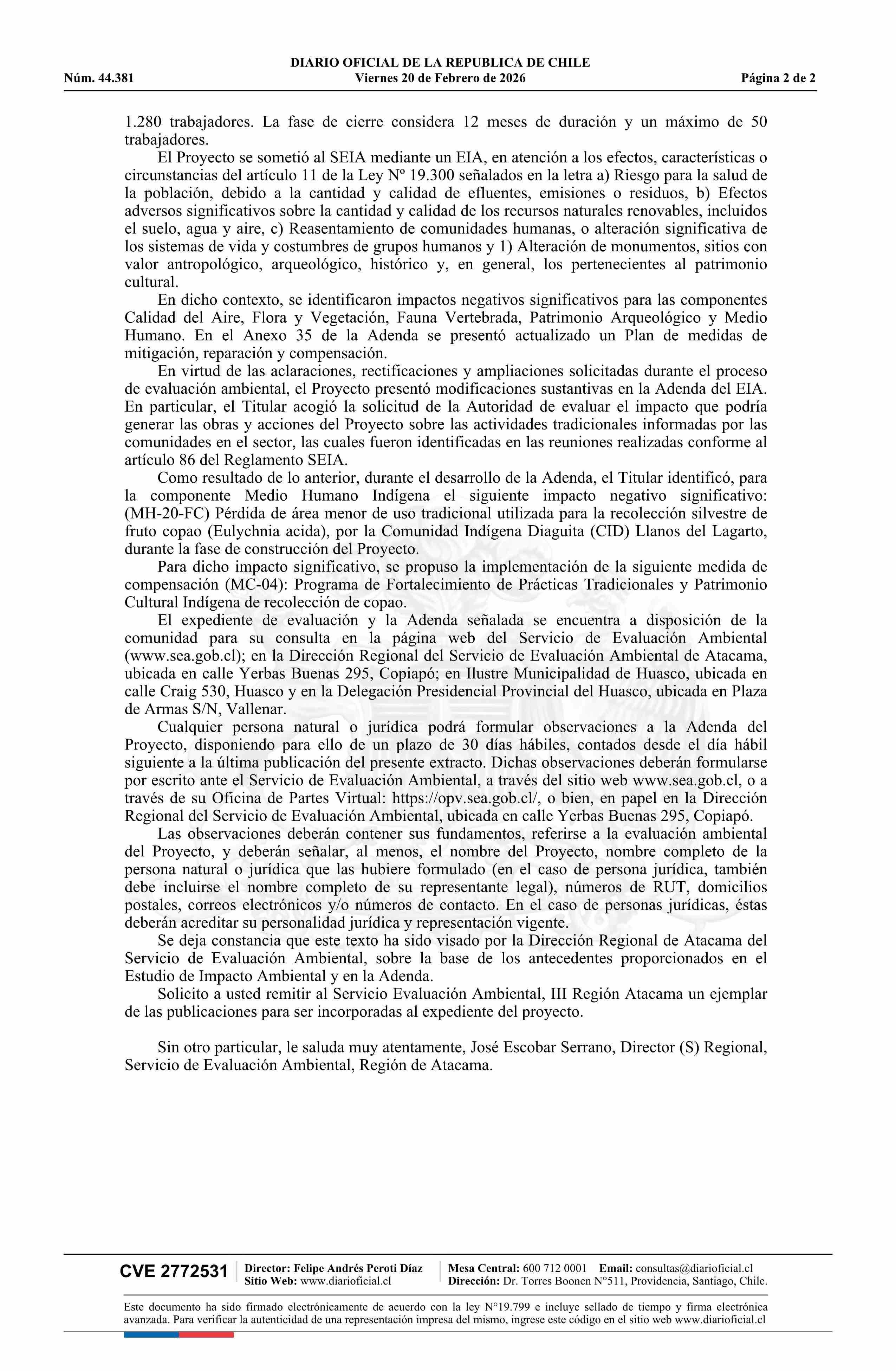 | Título: | Extracto de resolución exenta número 20260300119, de 2026.- Modificación Proyecto Mina Los Colorados: Ajustes y Continuidad Operacional Apertura de Participación Ciudadana por modificaciones sustantivas |