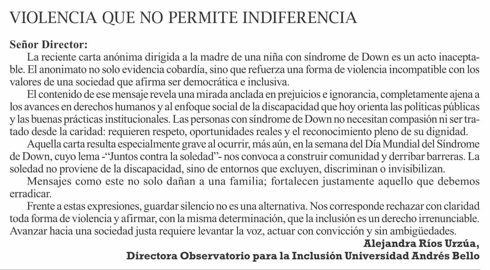 Cartas: Violencia que no Permite indiferencia