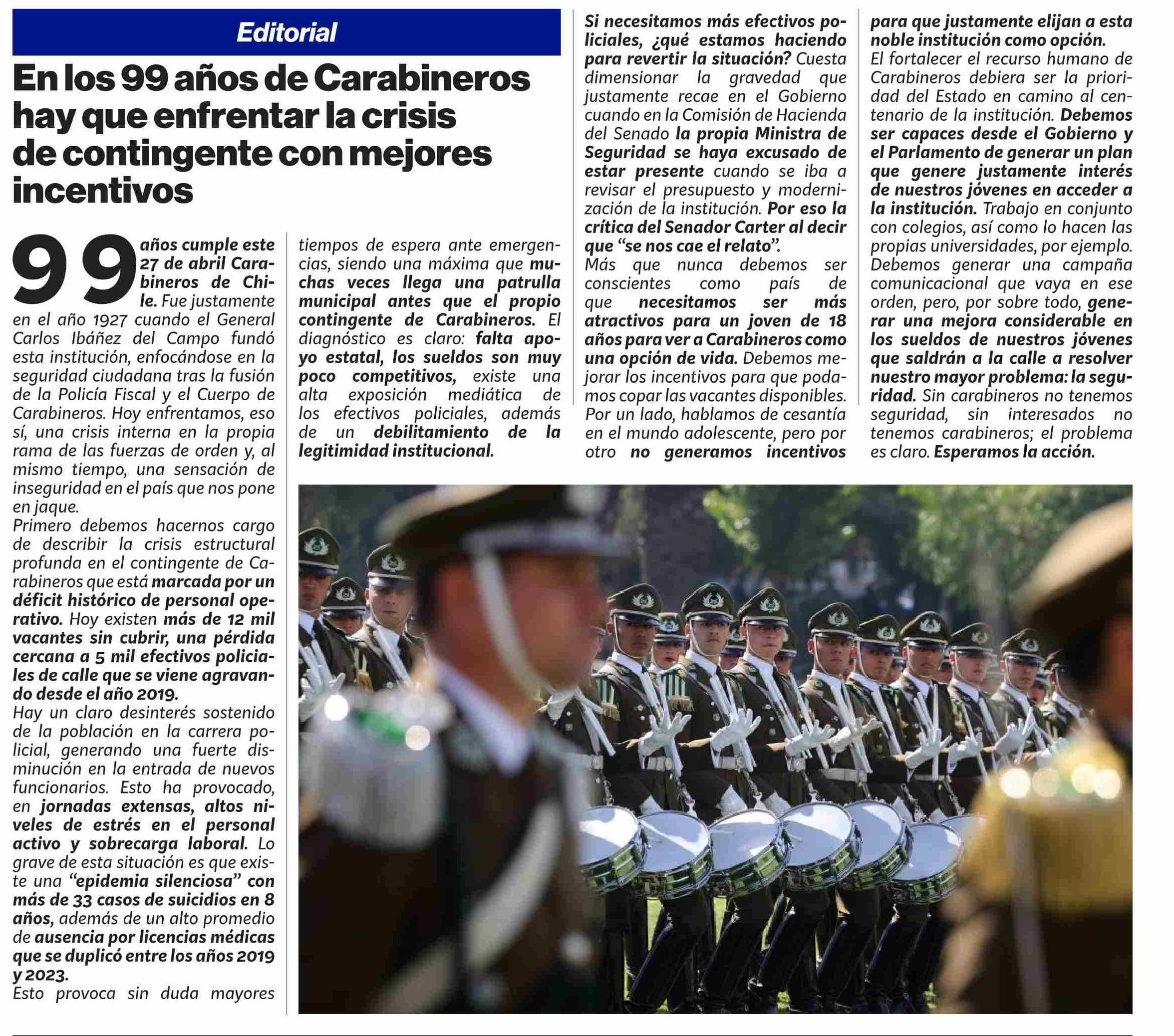 EDITORIAL: En los 99 años de Carabineros hay que enfrentar la crisis de contingente con mejores incentivos